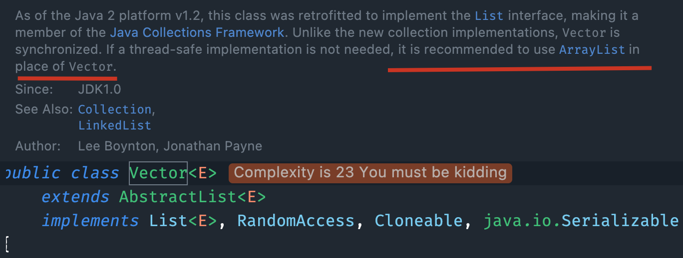 List 的实现类还有一个 Vector,是一个元老级的类,比 ArrayList 出现得更早。ArrayList 和 Vector 非常相似,只不过 Vector 是线程安全的,像 get、set、add 这些方法都加了 synchronized 关键字,就导致执行执行效率会比较低,所以现在已经很少用了。