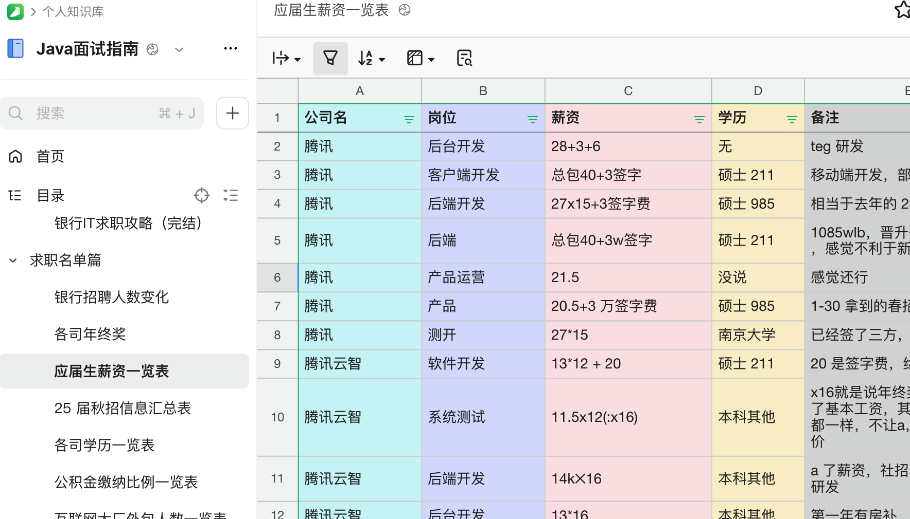 包括公司名、岗位、薪资、学历、签字费、股票、加班情况、三方协议、A 没 A 薪资这些信息,可以说是一清二楚。