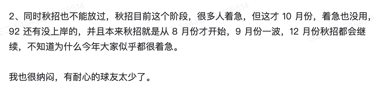 今年有耐心的同学格外少,我在星球里不止一次强调,秋招会持续到 12 月份,但有些同学不知道从哪里听到的风声,说过了 10 月就没机会了,搞得忧心忡忡,项目没心思做,八股没心思背,算法没心思刷。