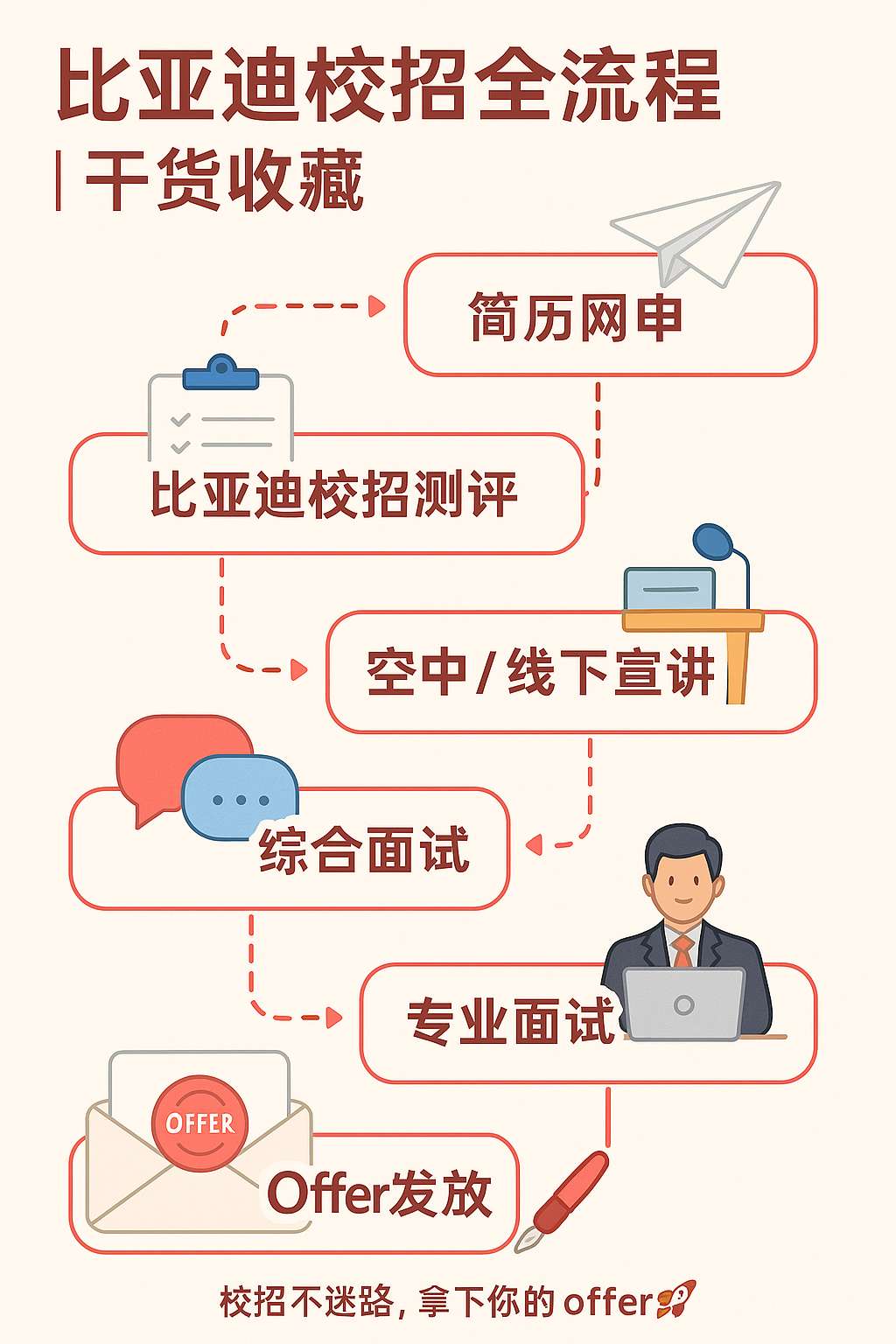 文字再赘述一下:简历网申→校招评测→空中线下宣讲→综合面试→专业面试→offer 发放。
