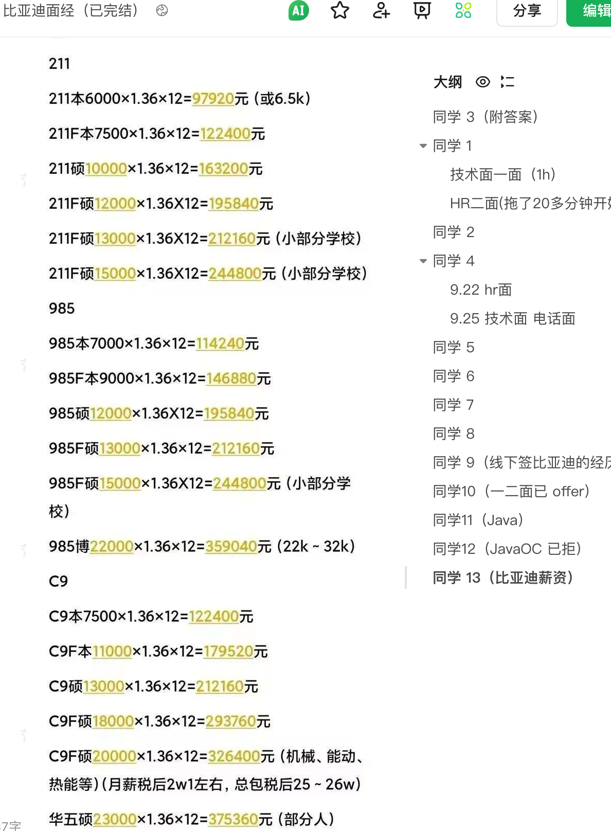 问了一些比亚迪的朋友,说上面这份一览表很假,不够准确,还不如看 23 届的,那为了方便大家参考,23 届的我也贴一下。