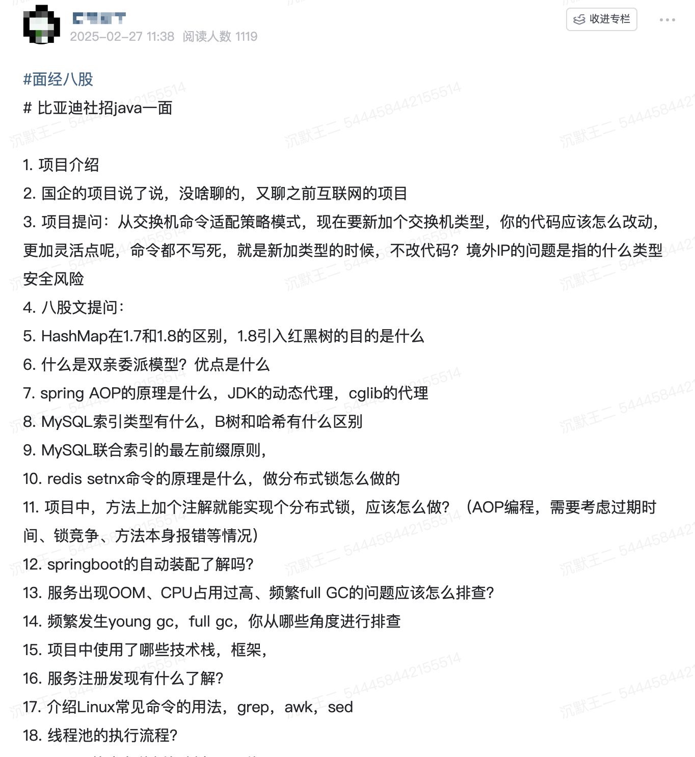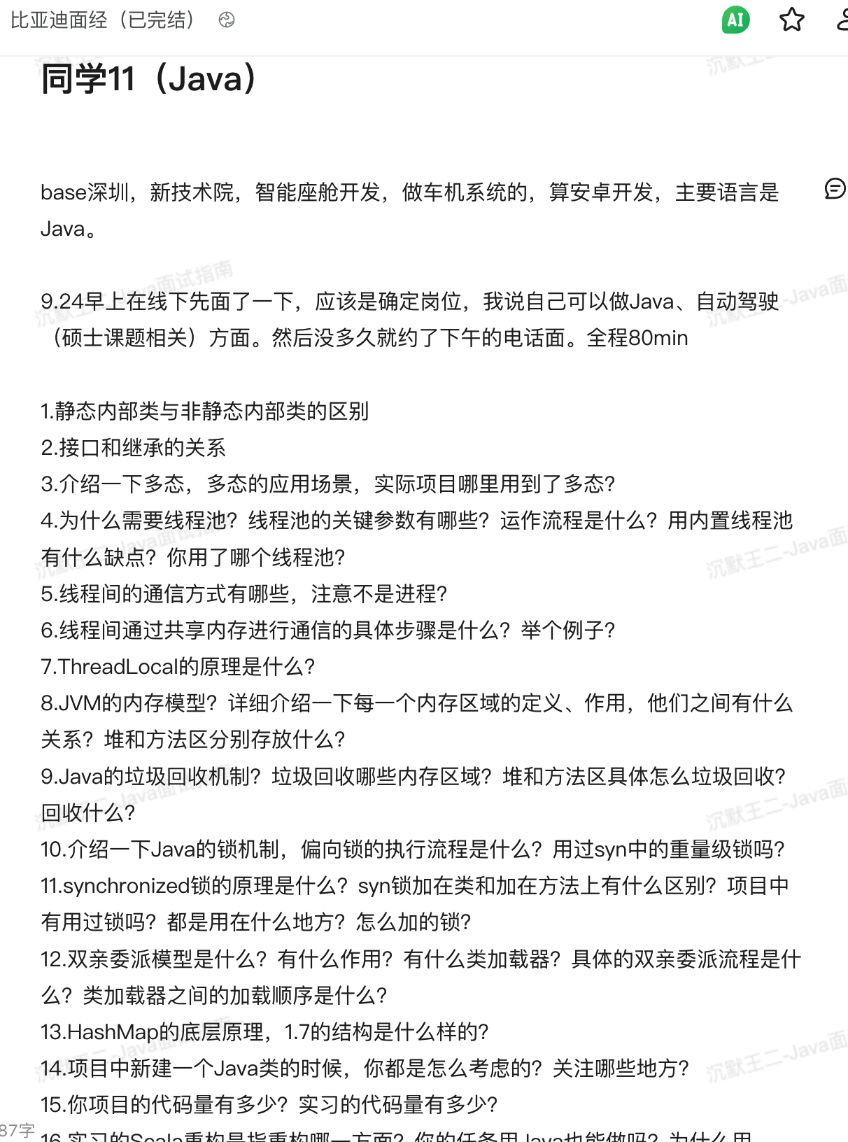 我再贴一个参加比亚迪社招的球友分享的面经:https://t.zsxq.com/VmHWq