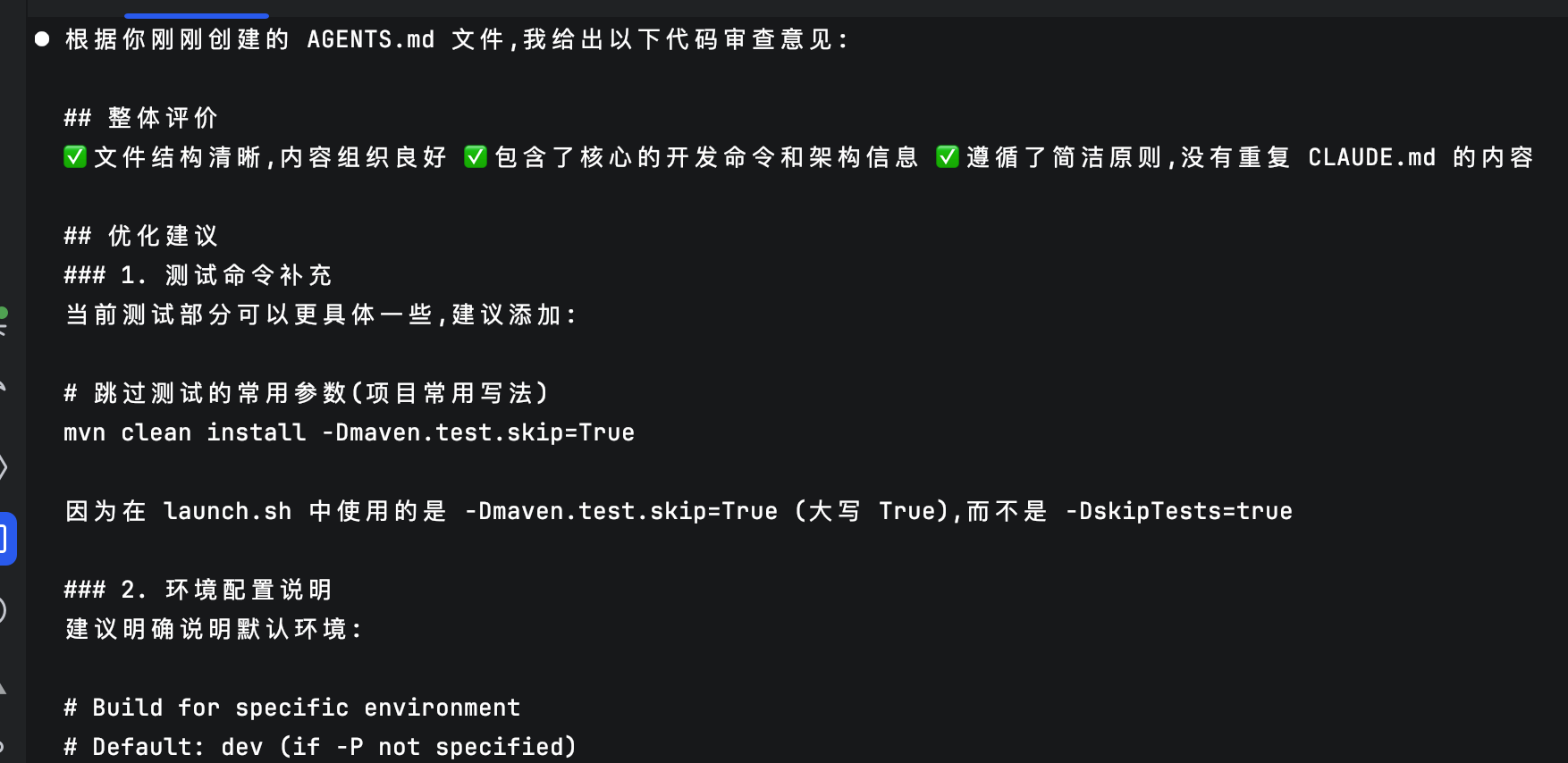 那我们先来小试牛刀一下,试试 Qoder CLI 的代码审查能力,执行 /review 命令即可,Qoder CLI 就会针对当前正在修改的内容给出分析报告。