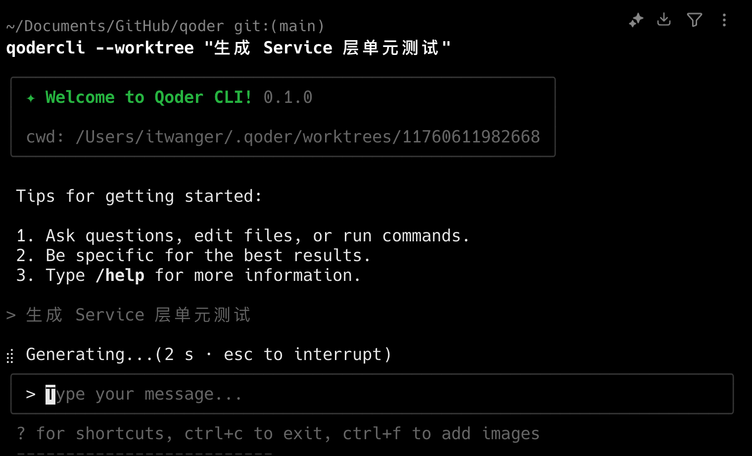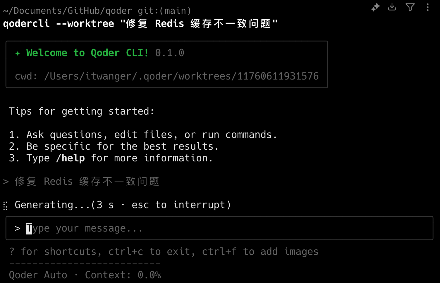 通俗点讲,就是,我们可以在同一个项目里,开出多个“平行宇宙”的分支(每个都是独立的工作目录),每个分支都运行着一个独立的 Qoder CLI 实例(带独立会话和记忆)。