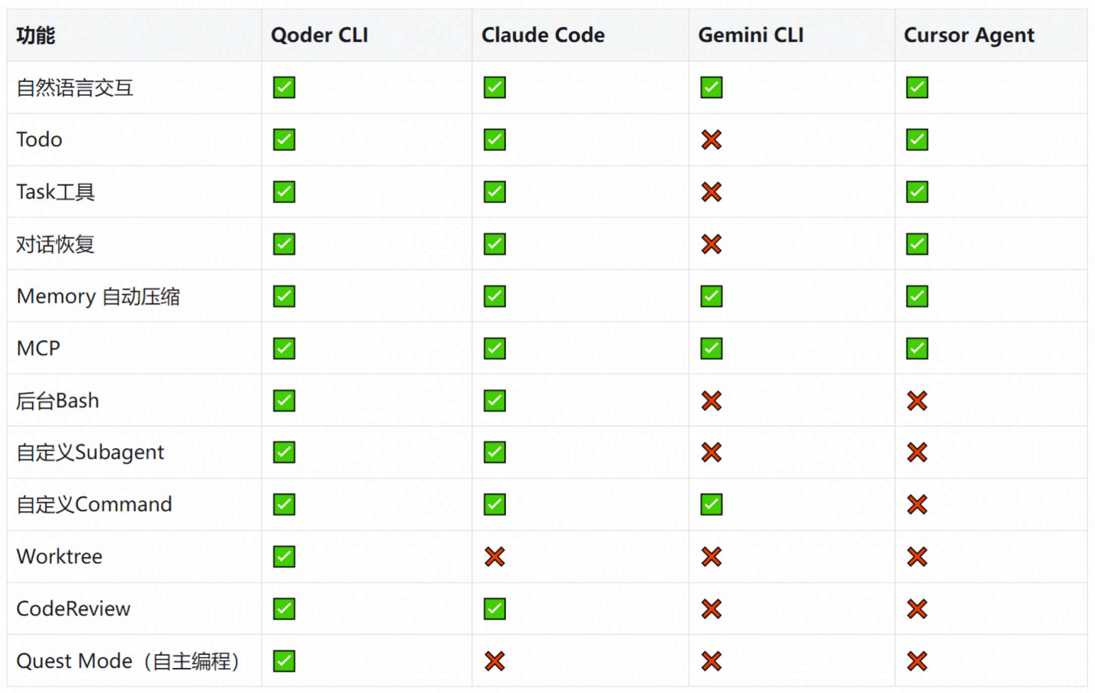 从下面这张图就能看出,阿里的雄心壮志,势要比 Claude Code、Gemin CLI、Cursor Agent 更强大,功能更完善。