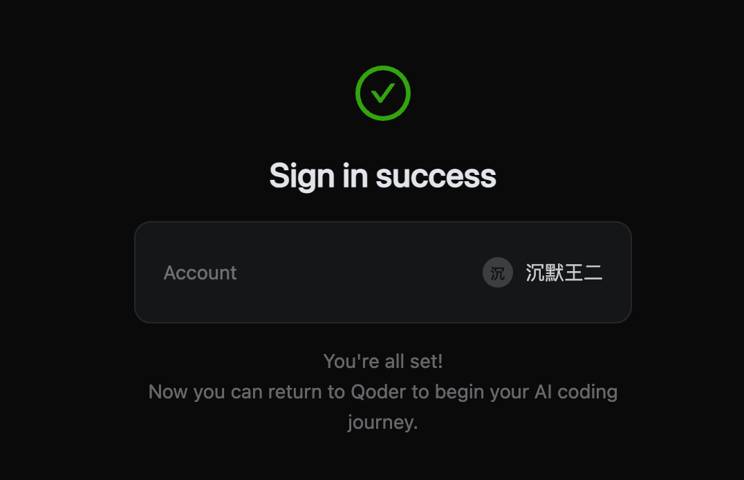 然后再输入 /login 登录账号,可以和 Qoder 保持一样,这样他们就可以共享同一套账号体系、云端服务额度与配置信息。