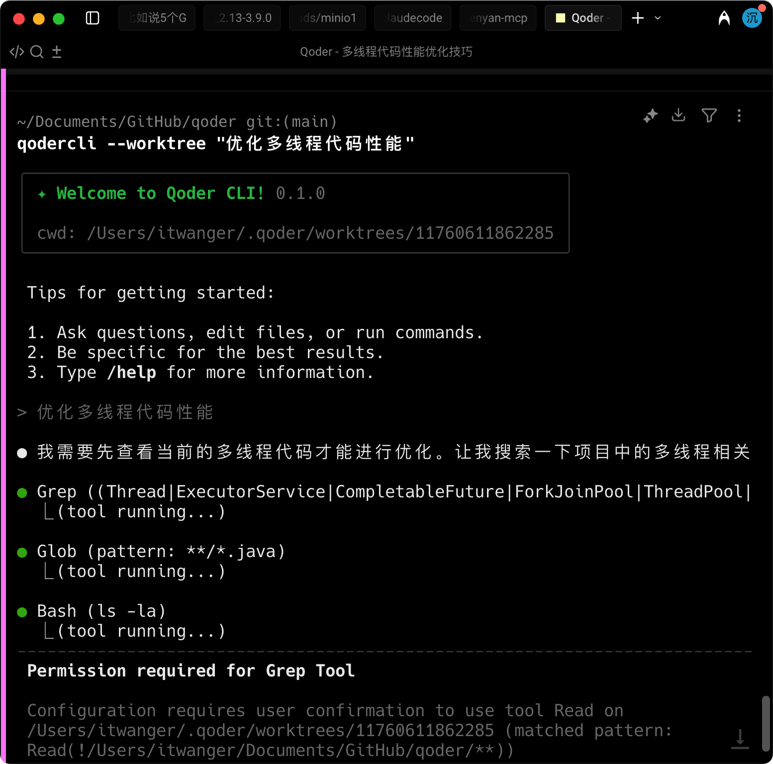 比如说,我们先开一个并发优化任务的 Qoder CLI。