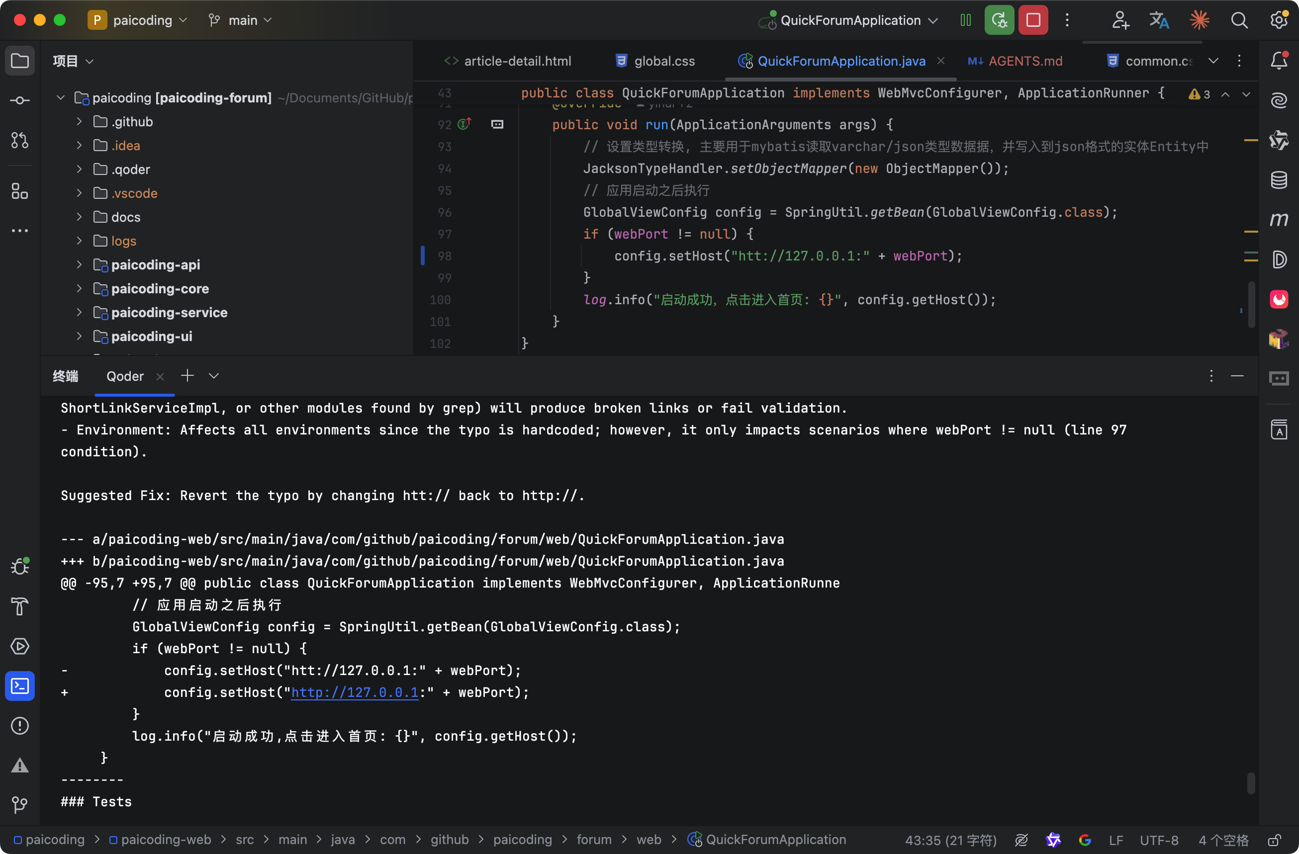 我其实在代码中留了一个小坑,就是把 http 改成了 htt,那 Qoder CLI 就毫不留情的检出来了。