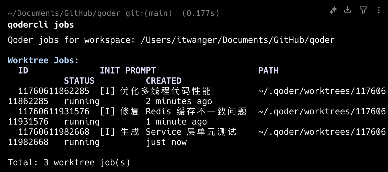 这些 worktree 任务都能并行启动,互不干扰。每个任务执行完,我们可以用 qodercli jobs 查看状态,然后 git merge 把满意的结果合回主分支。