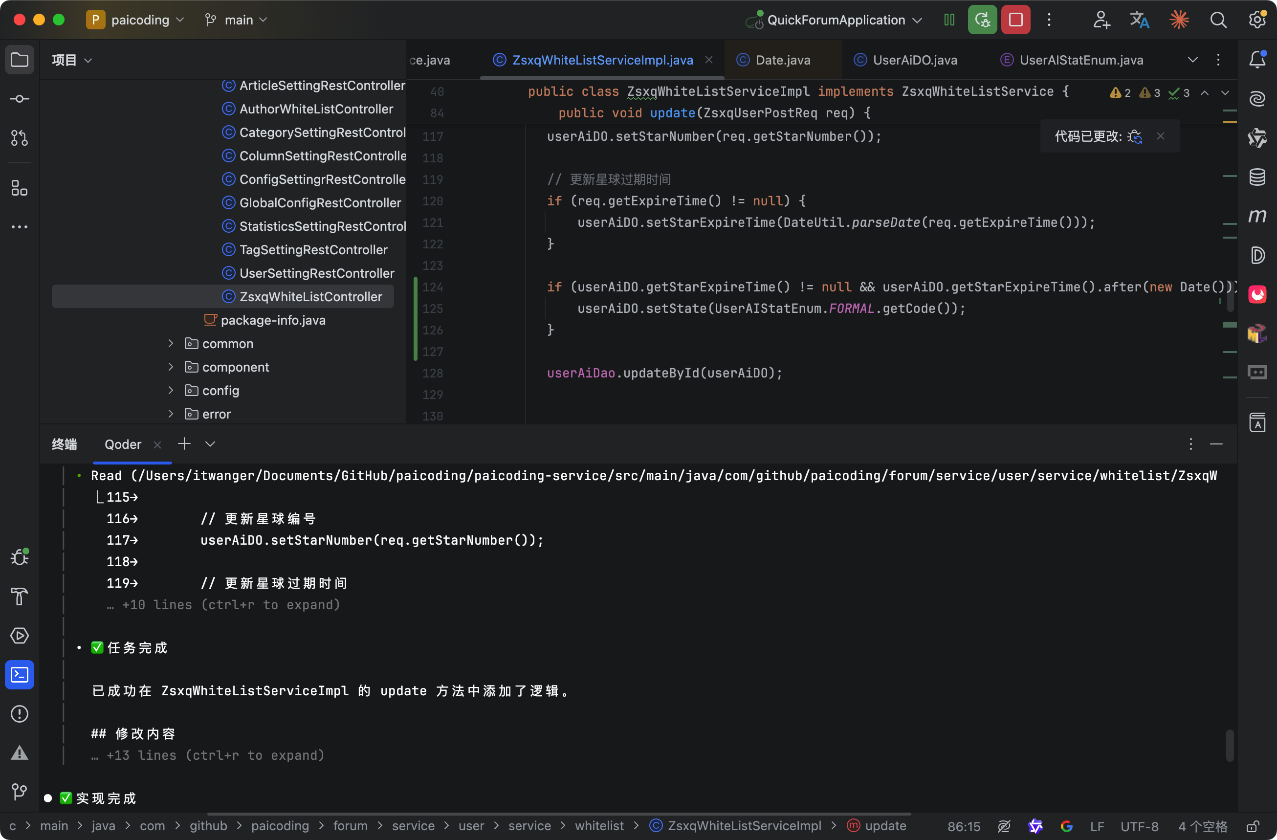 /quest ZsxqWhiteListServiceImpl在update的时候,我希望星球过期时间如果大于当前时间的话,就给 userAiDO 的 状态设置为正式用户