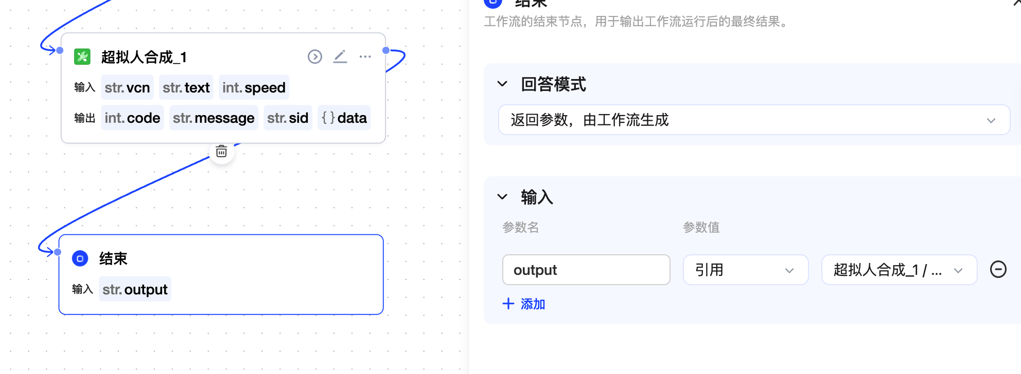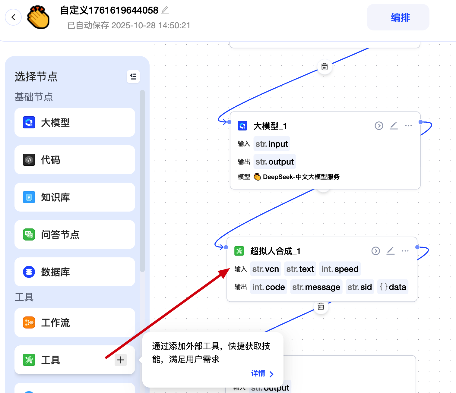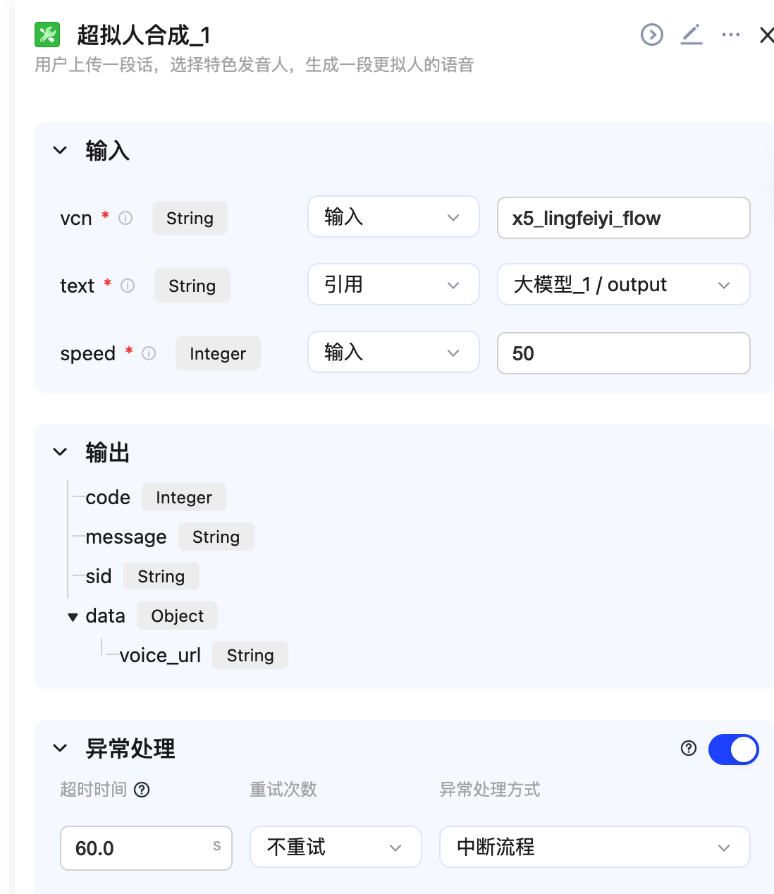 再从工具中添加一个【超拟人合成】,用于把大模型的输出文本转换为语音。