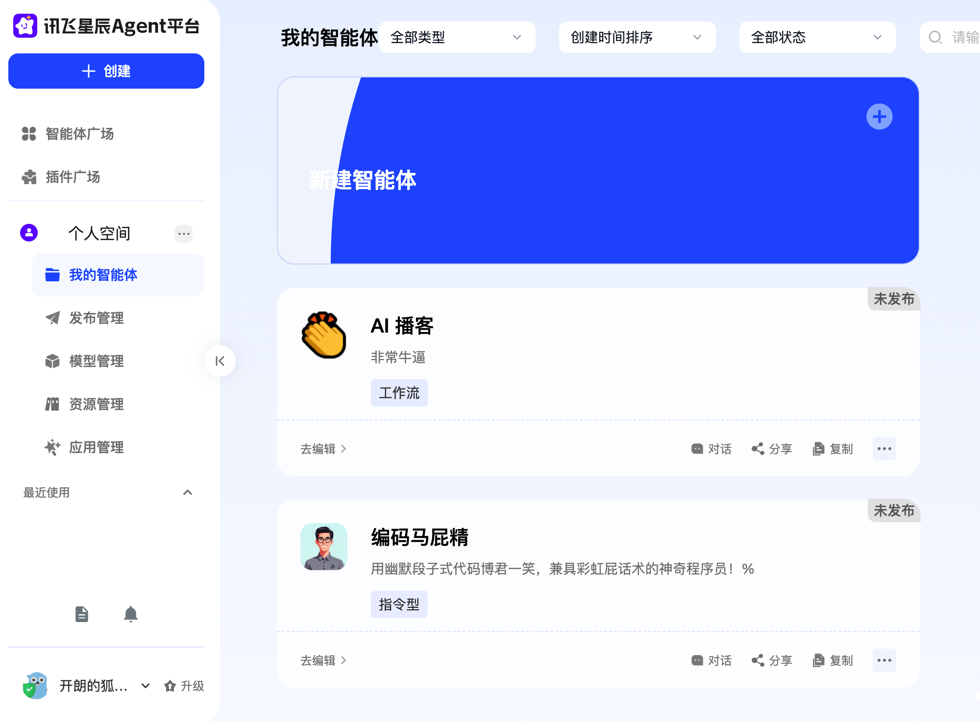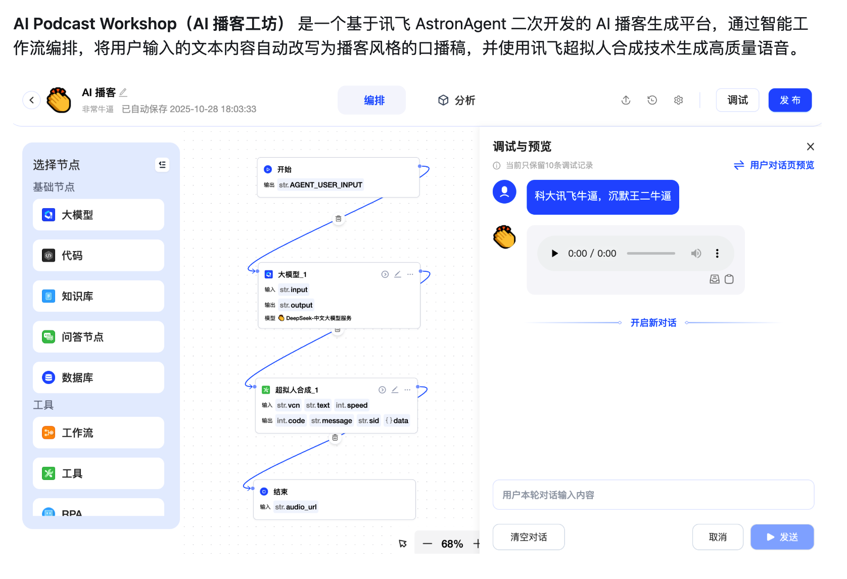 里面有我搭建好的工作流 AI 播客,可通过智能工作流编排,将用户输入的文本内容自动改写为播客风格的口播稿,并使用讯飞超拟人合成技术生成高质量语音。