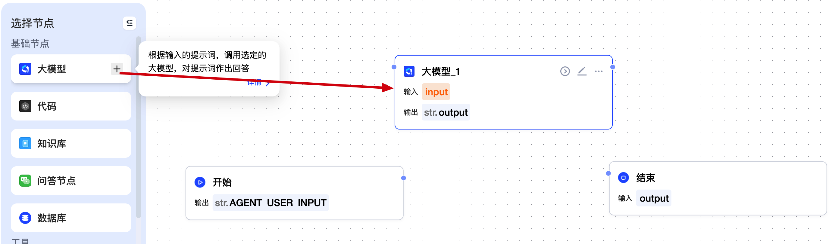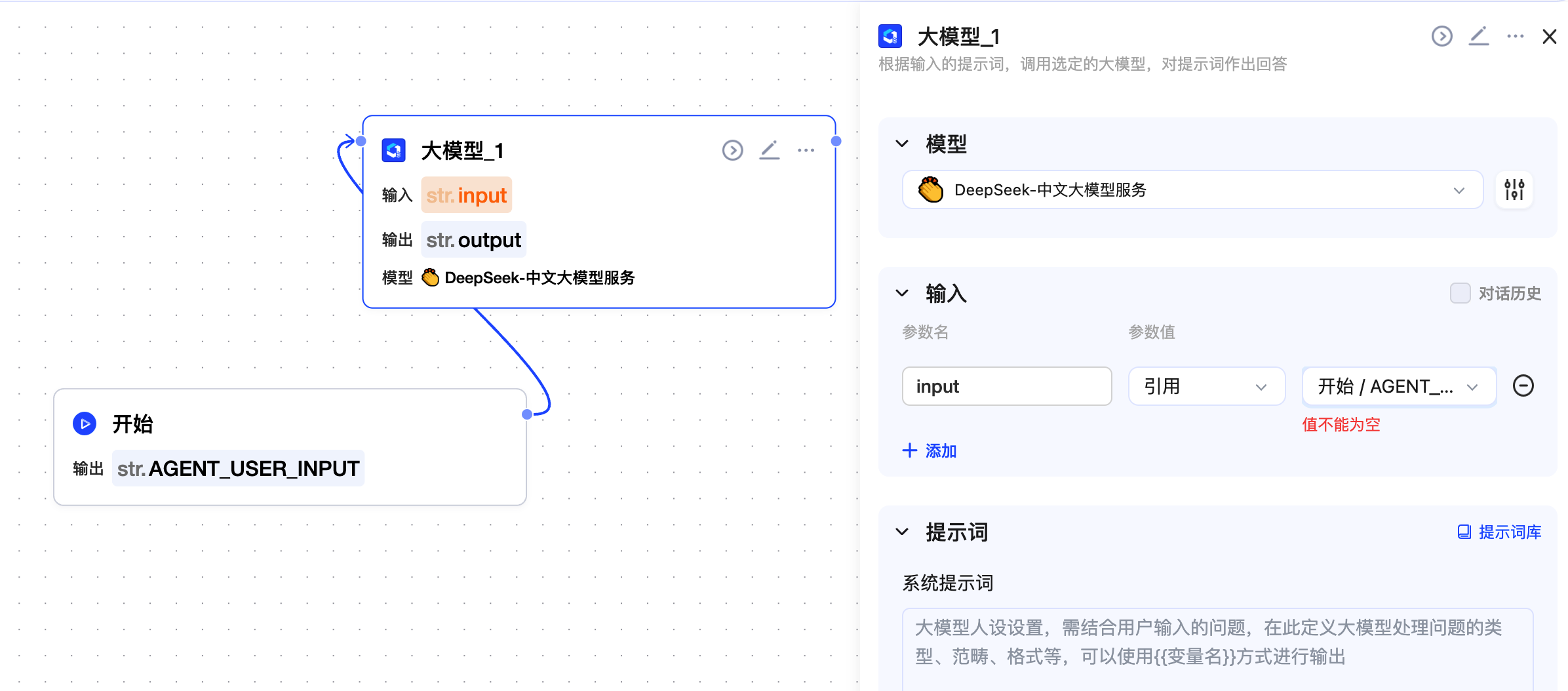 把输入指向 DeepSeek,然后就可以在 input 这里追加用户输入的提示词作为输入参数。