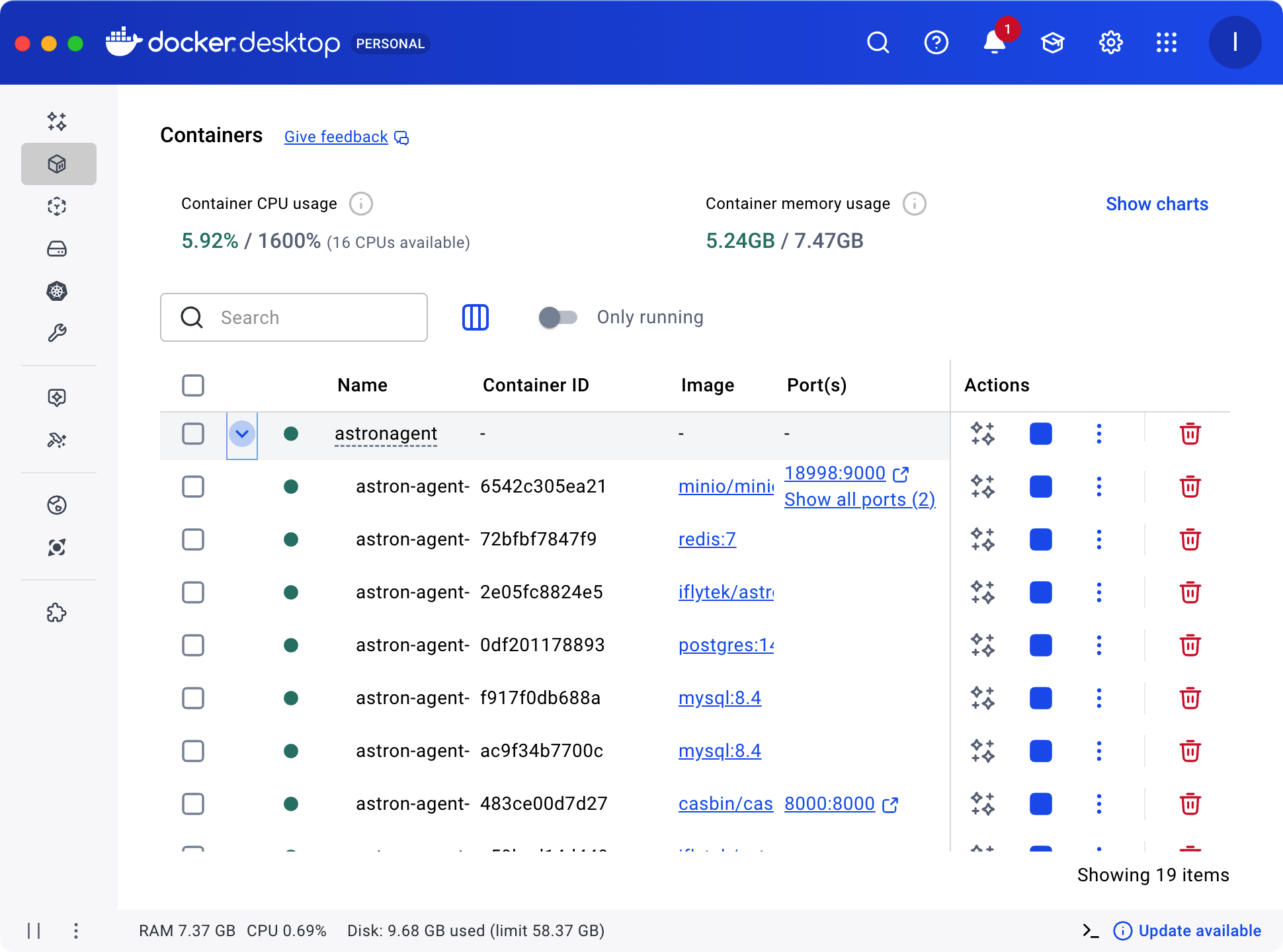 完事就可以在 Docker 容器面板中看到所有的前置服务都已经启动完成。