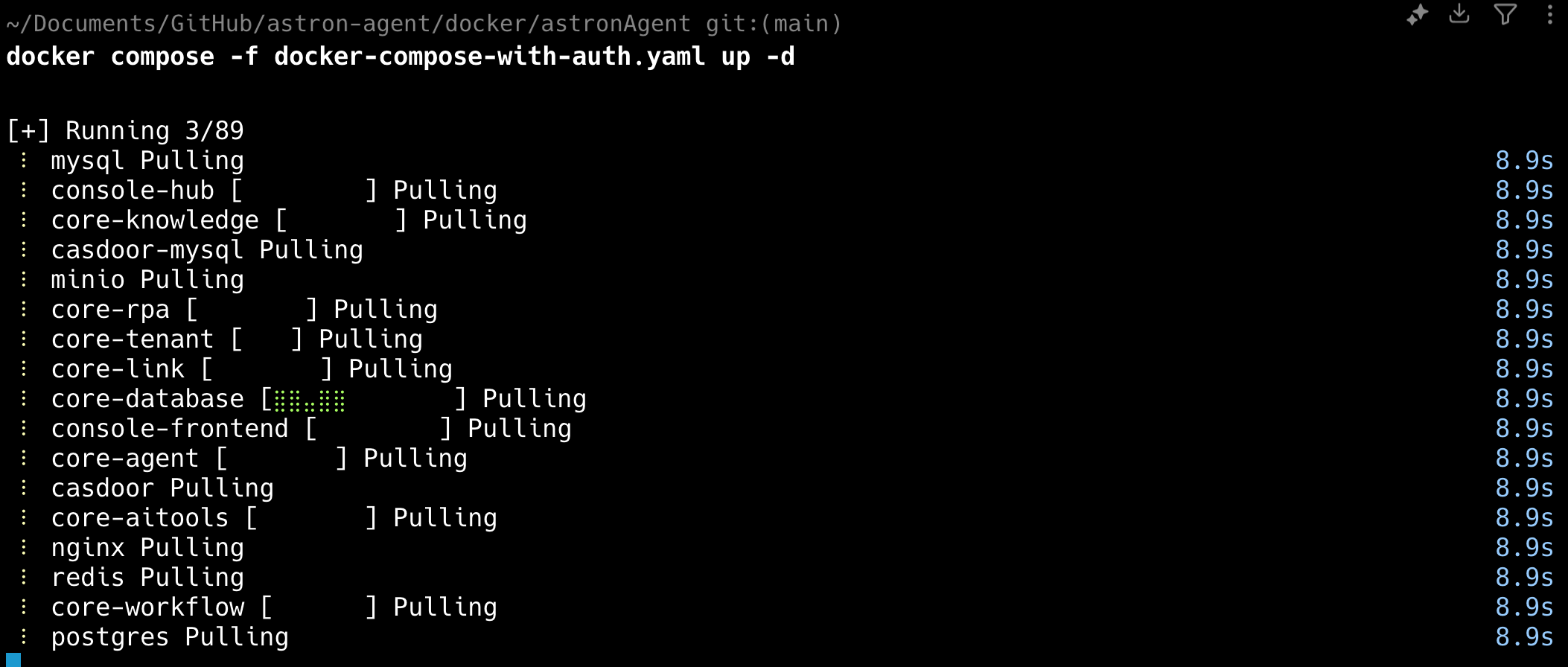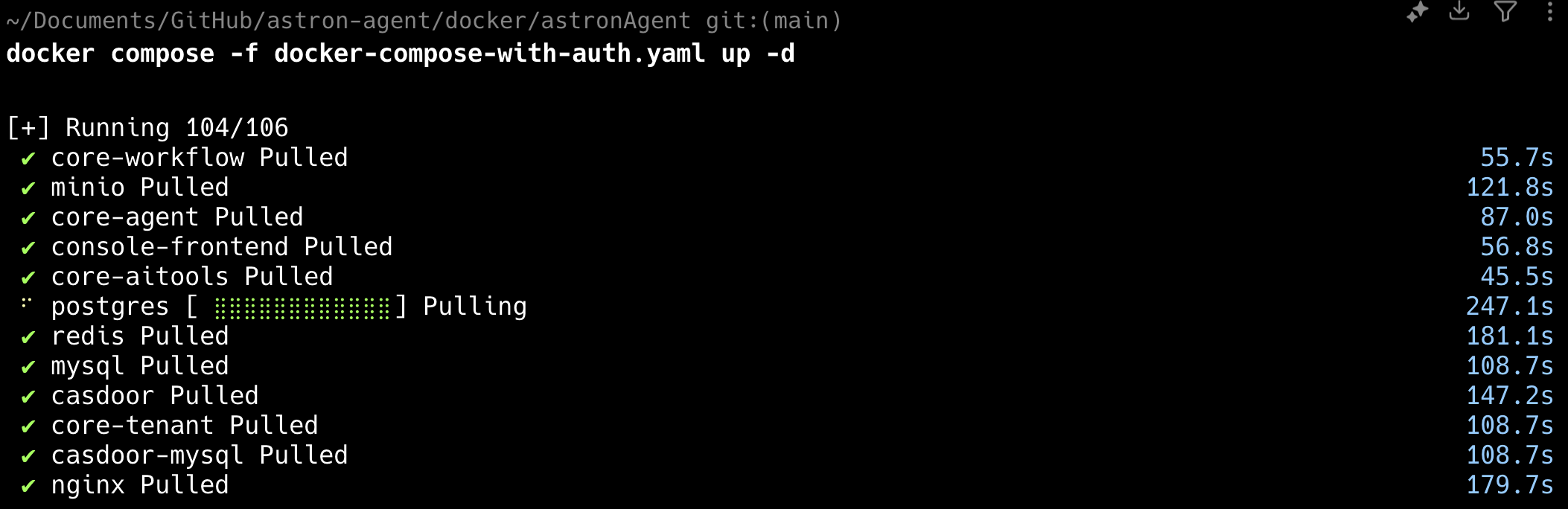 接着执行 docker compose -f docker-compose-with-auth.yaml up -d 拉取所有镜像,这个过程可能需要一点时间,耐心等待即可。