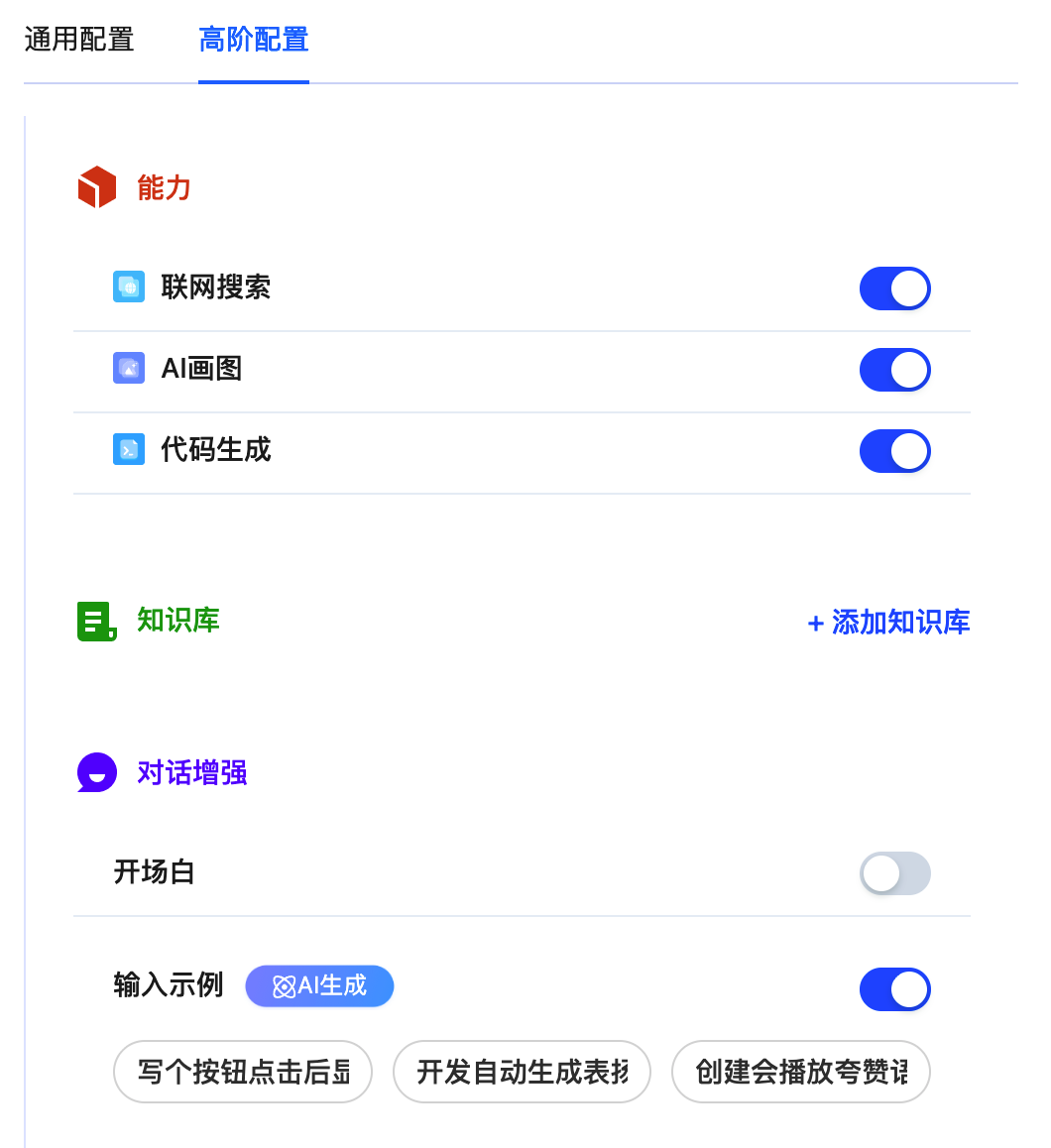 【高阶配置】里还可以开启联网搜索、AI 画图、代码生成、添加知识库、多轮对话等等。