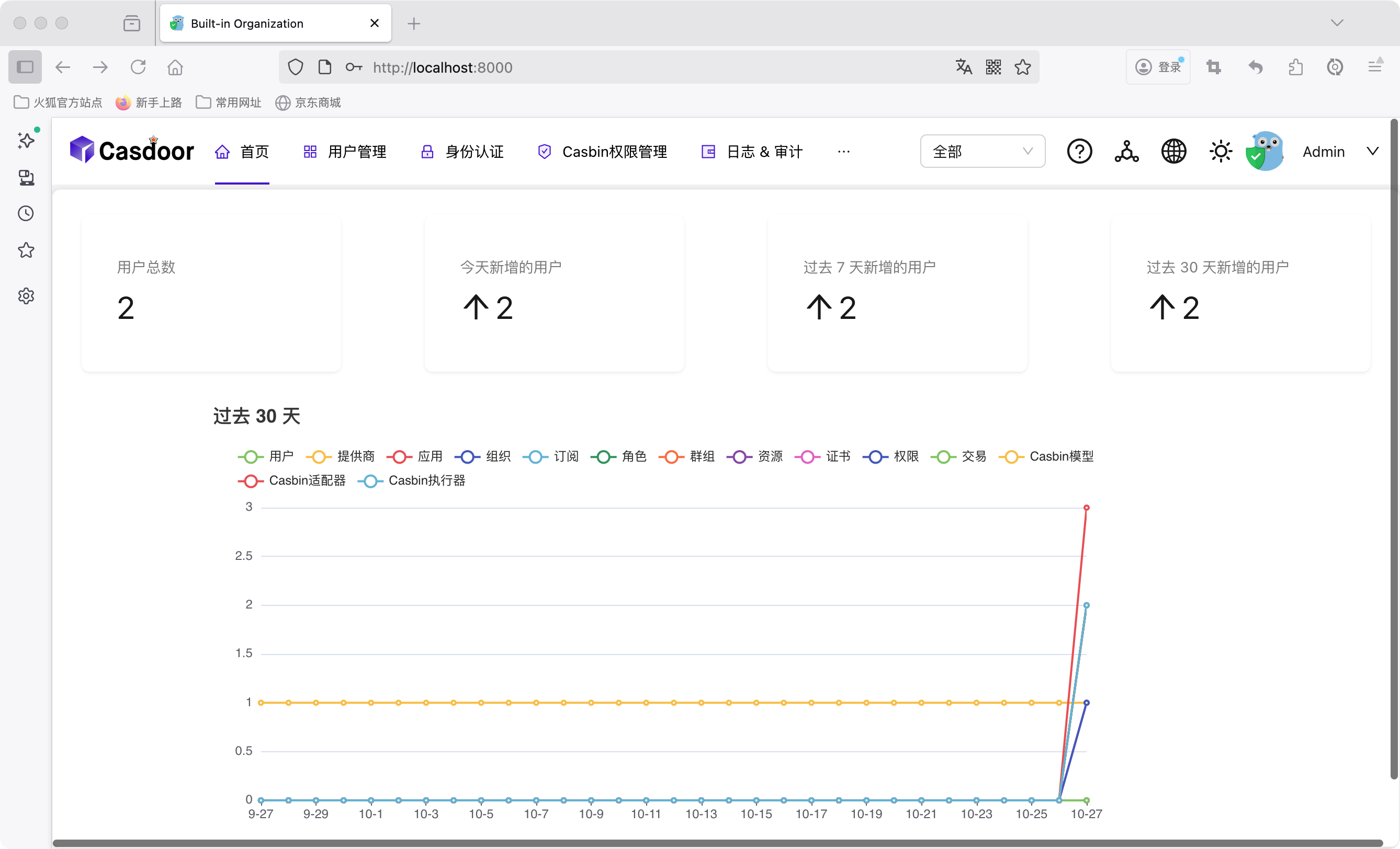 接着,我们就可以在浏览器地址栏里访问 http://localhost:8000/ 启动 Casdoor 管理界面。用户名默认为 admin,密码为 123。