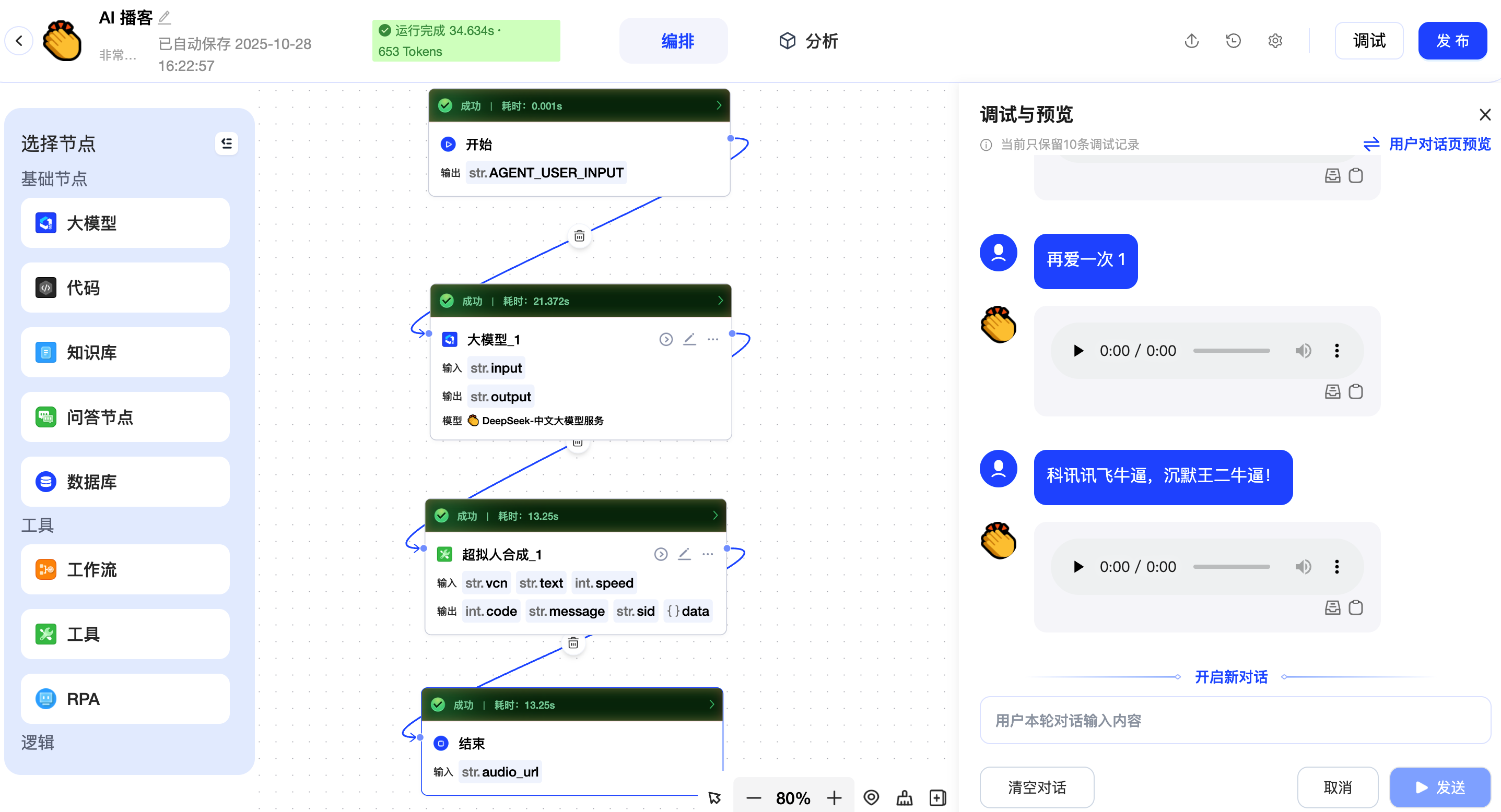 - 构建多模型语音合成工作流,集成 DeepSeek 大模型与讯飞超拟人合成服务,实现"文本 → 播客风格改写 → 语音合成"的端到端流程,支持自定义发音人和语速参数