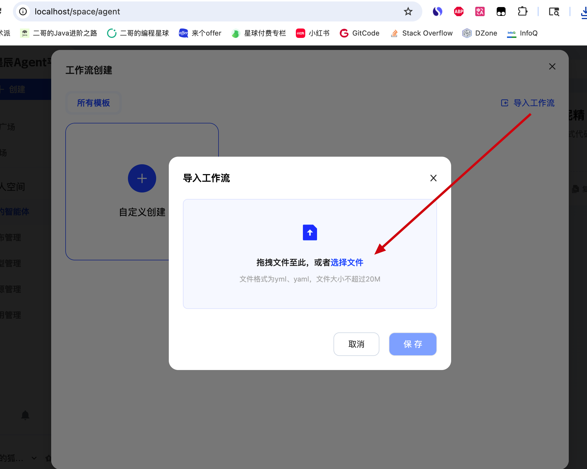 当然如果你不想这么麻烦,也可以直接导入我编排好的工作流,在工作流创建这里选择导入工作流,选择 AI 播客.yml 文件即可。
