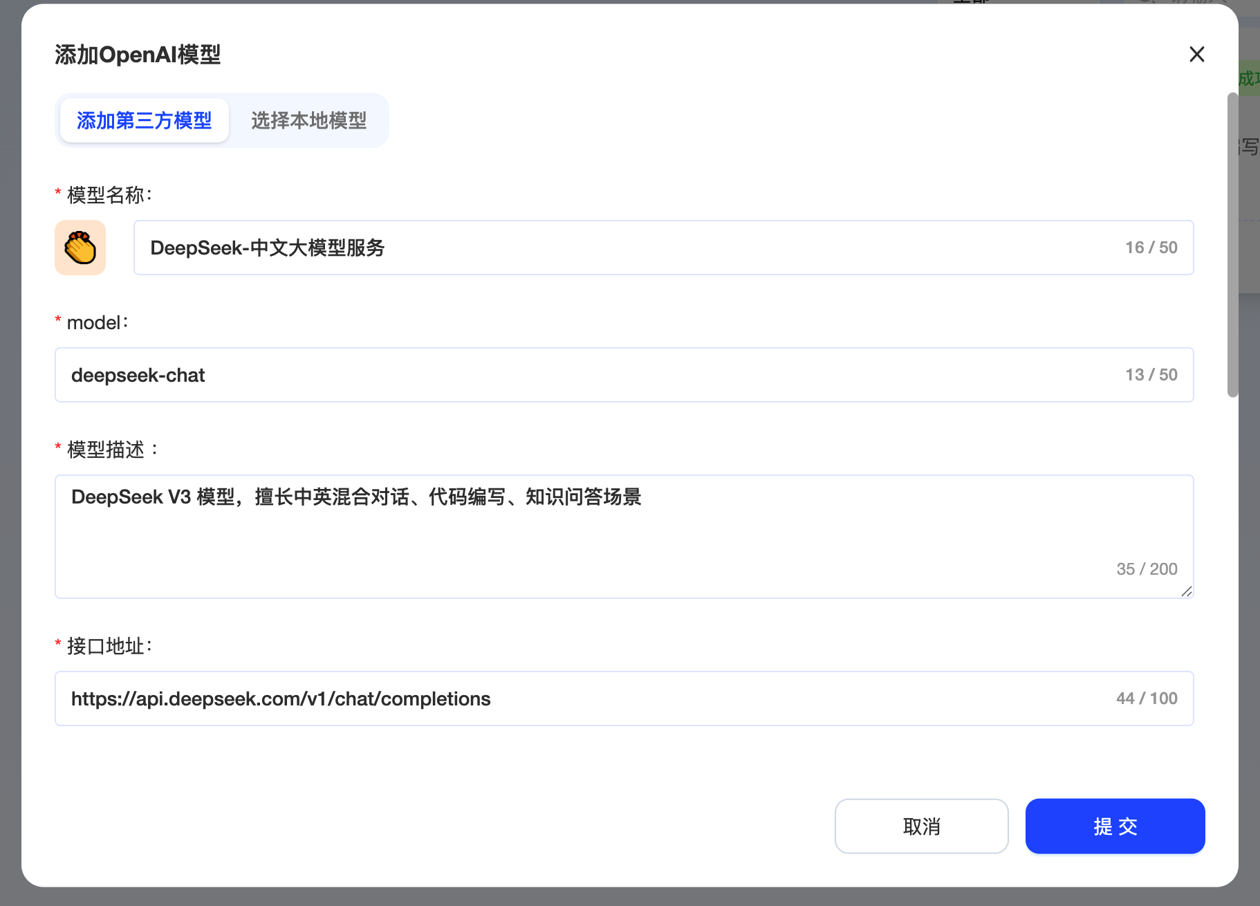 然后在添加模型这里增加一个 DeepSeek,名称可以随便起,model 的话就填 deepseek-chat,模型描述可以暂时填“DeepSeek V3 模型,擅长中英混合对话、代码编写、知识问答场景”。