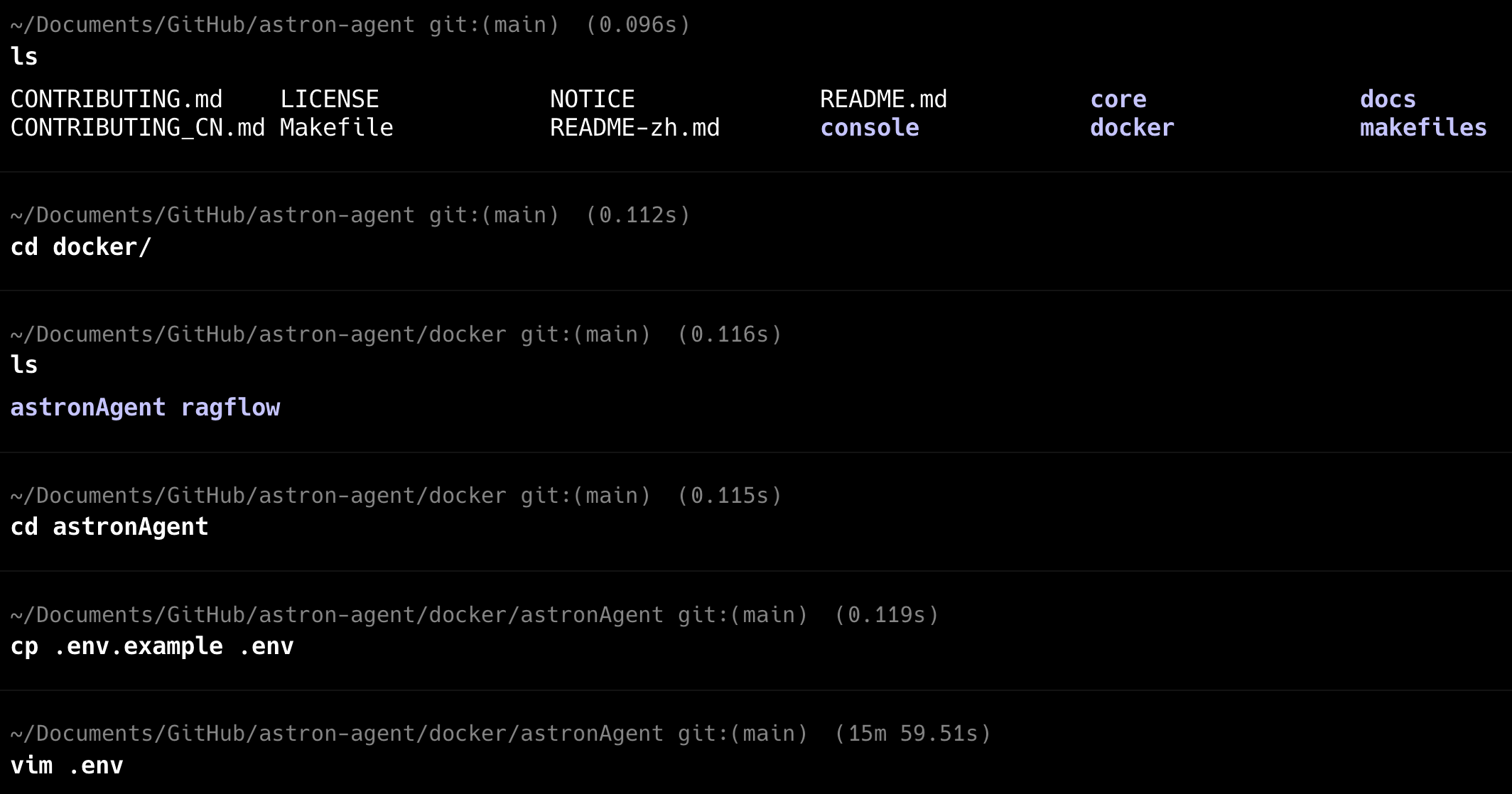 注意是在 docker/astronAgent 目录下,先复制一份环境变量配置 cp .env.example .env,然后在 .env 文件中找到 PLATFORM_APP_ID 等配置项,修改为你自己的 key 就行了。