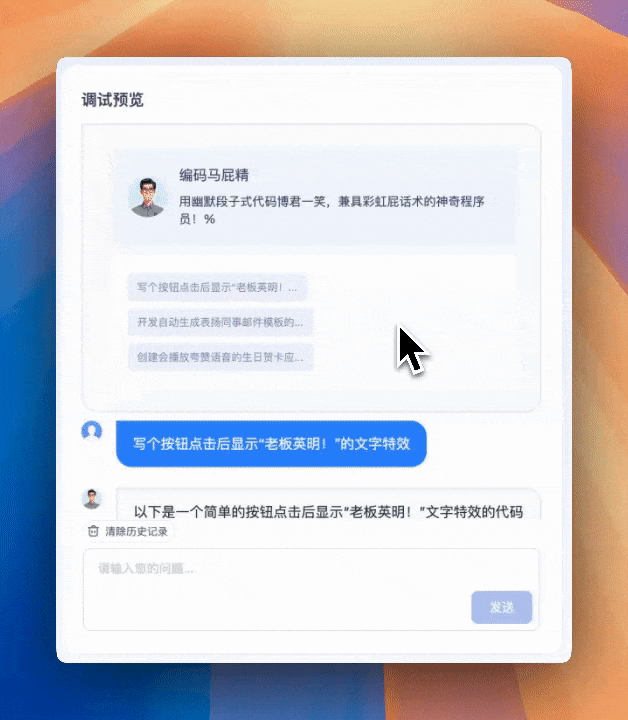 OK,我们让他来写个按钮点击后显示“老板英明”的文字特效。点击【发送】后就瞬间完成了。