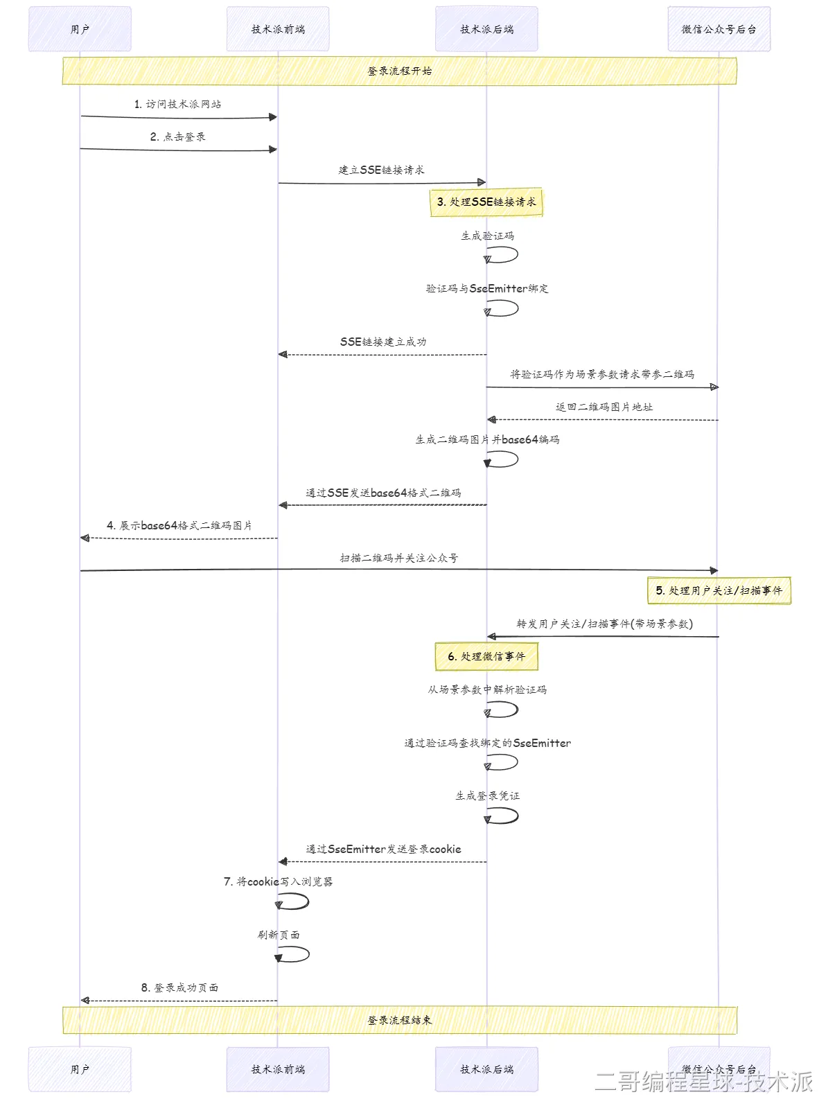 都是企业级 Web 应用开发必备的技术方案。看一下服务号扫码登录的流程图吧。