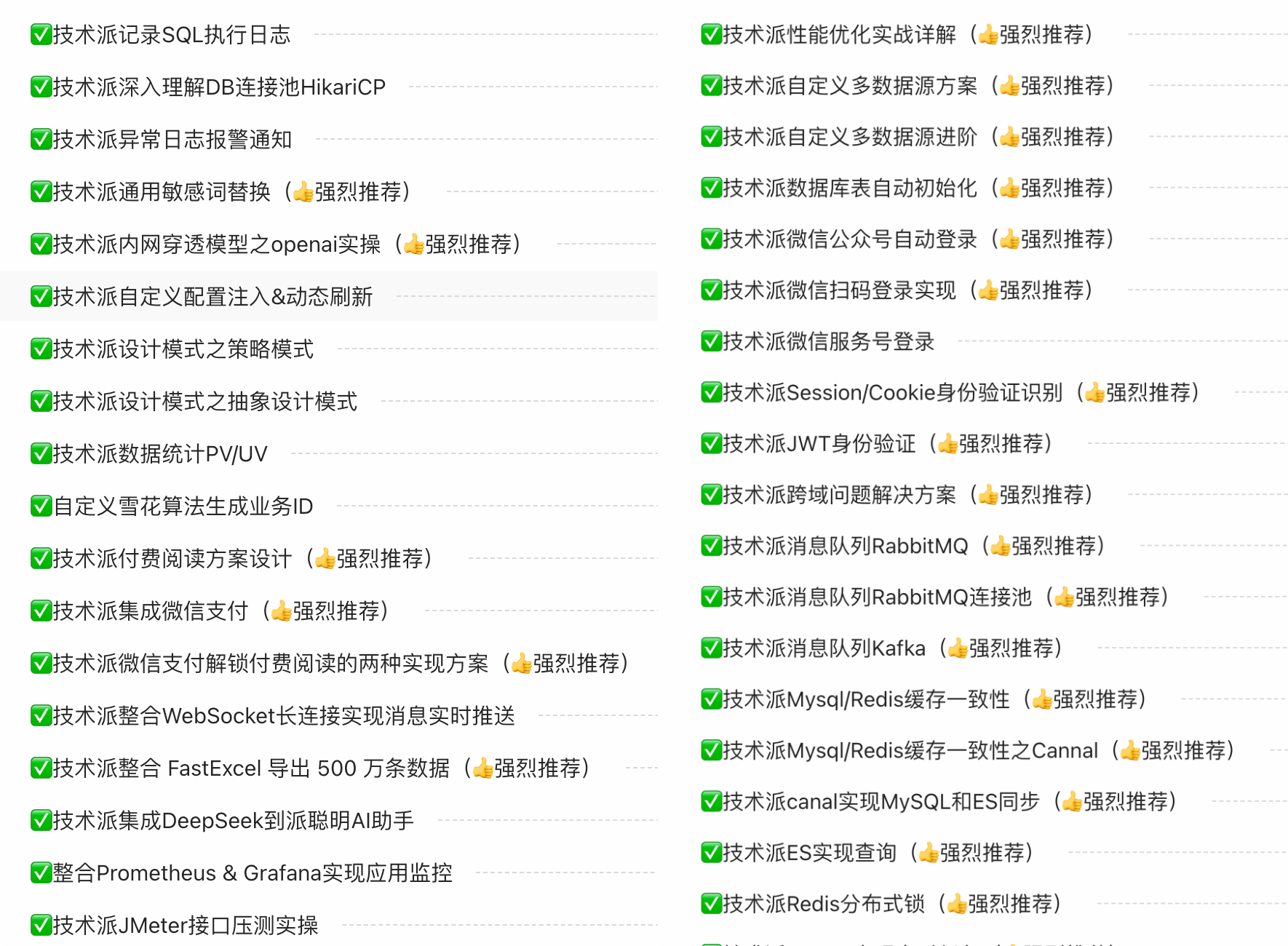 基本上覆盖了 Web 开发的方方面面,有性能优化、多数据源配置、公众号扫码登录、JWT 身份认证、跨域解决、消息队列(RabbitMQ+Kafka)、ElasticSearch、xxl-job、普罗米修斯、连接池、微信支付、WebSocket、JMeter、FastExcel、设计模式、DeepSeek 的 AI 助手接入等等。