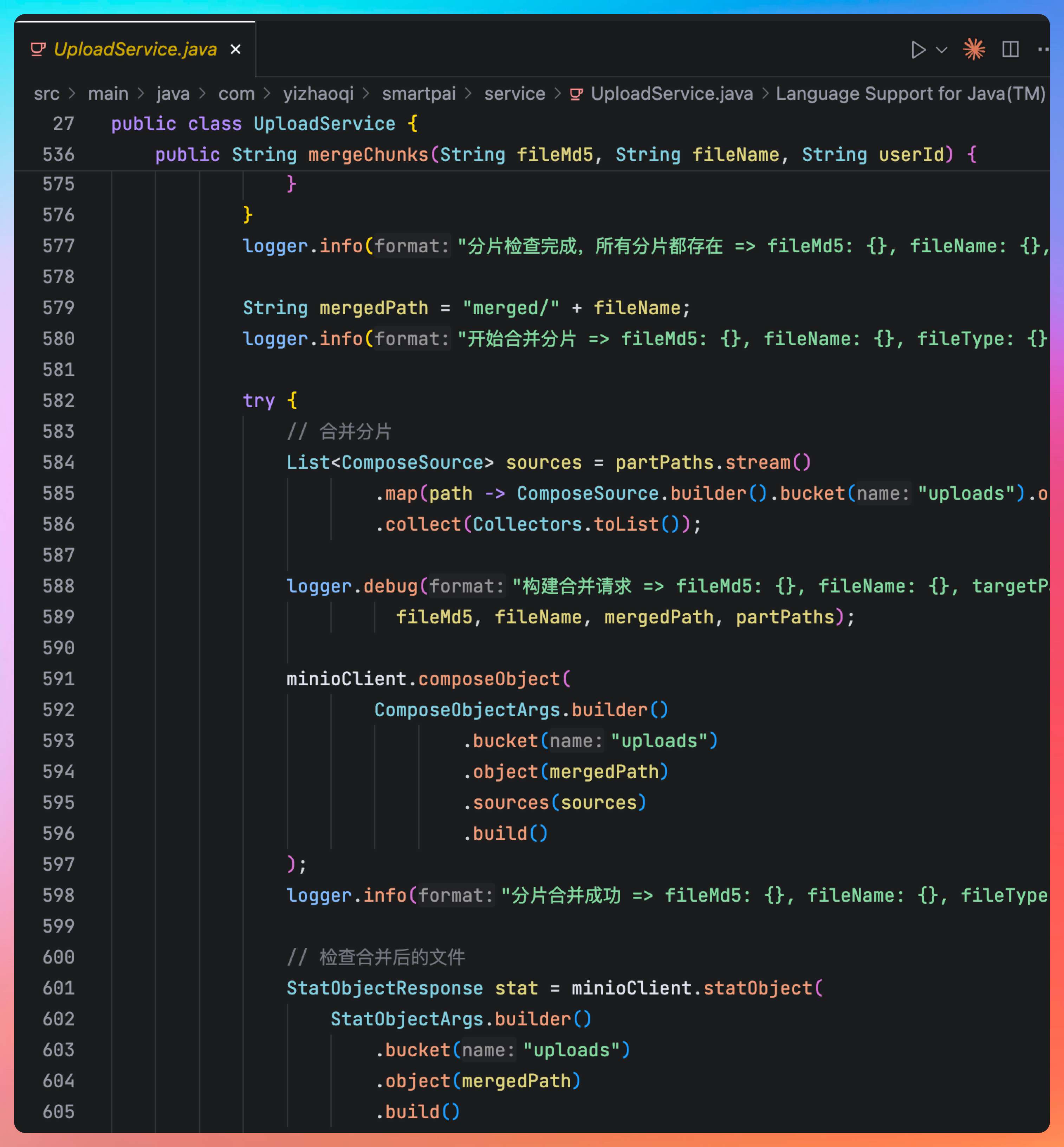 第二步,当后端接收到分片上传请求后,直接将这个分片存入 MinIO 的临时文件目录。