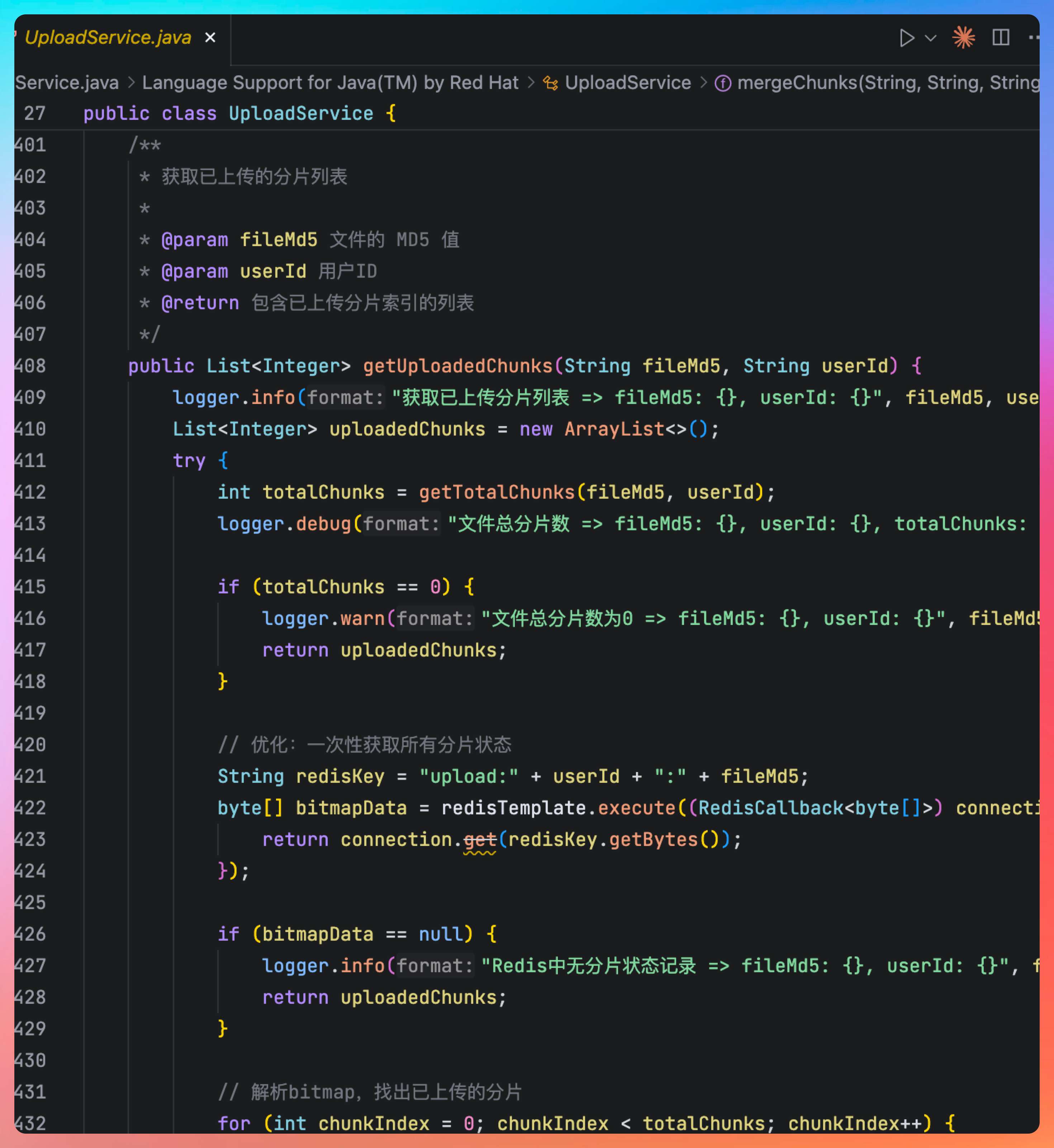 String redisKey = "upload:" + userId + ":" + fileMd5;