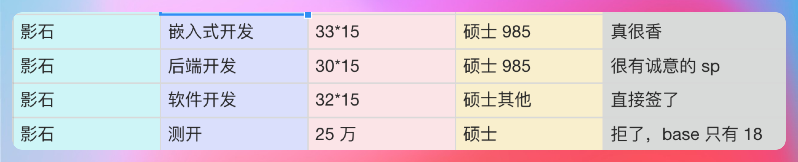 - 硕士 985,嵌入式开发,开了 33k,真的非常香,base 地是深圳。
