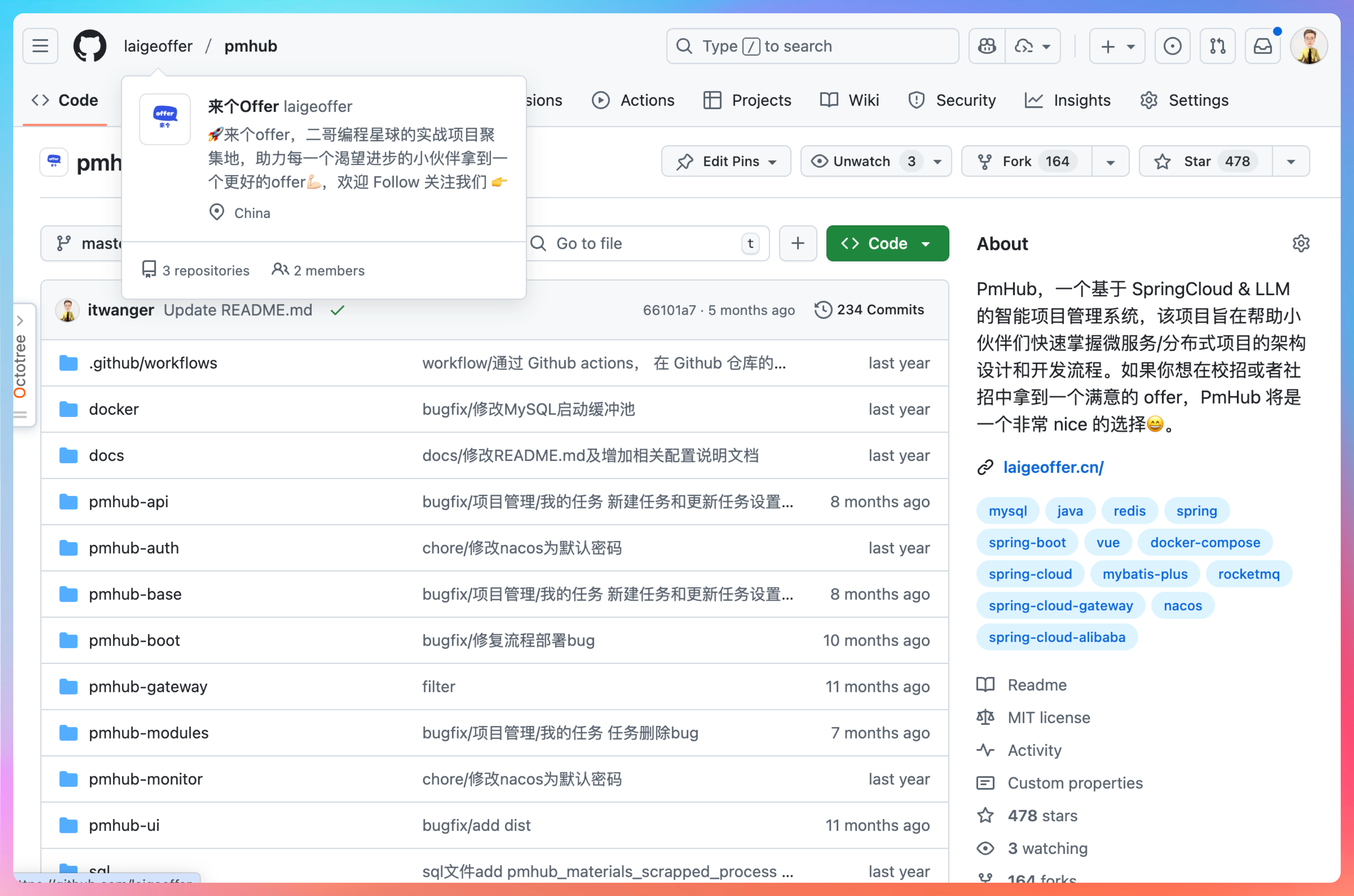 后面我会详细分享微服务项目 PmHub 的学习路线,代码是在 GitHub 上开源的。