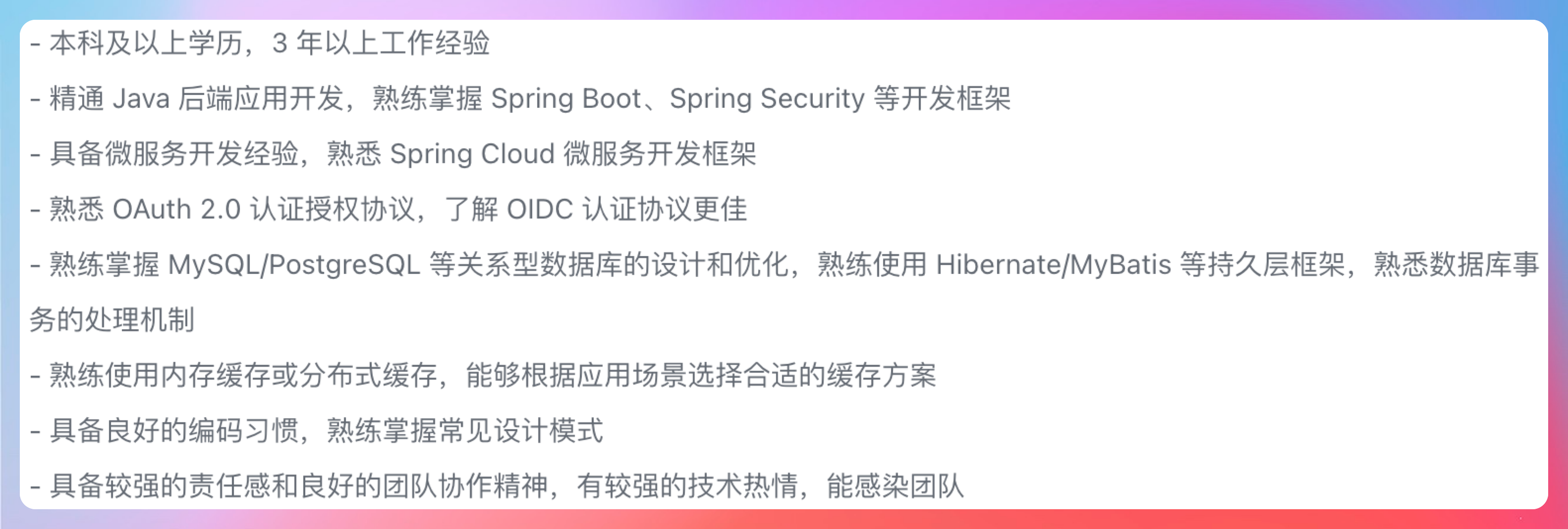 我去他们官网看了一下,Java 后端开发的 JD 要求如下(社招岗),非常传统,基本上就是我一直给大家强调的 Java 后端四大件(Java 基础、MySQL、Redis、Spring 全家桶),外加一些分布式和设计模式的经验。