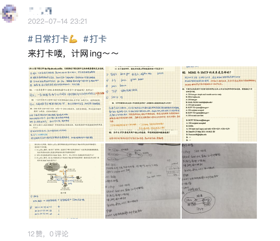 然后就开始了一段非常自律的学习,给大家看看他当时的打卡记录,下面是计网的知识点总结,非常详细。