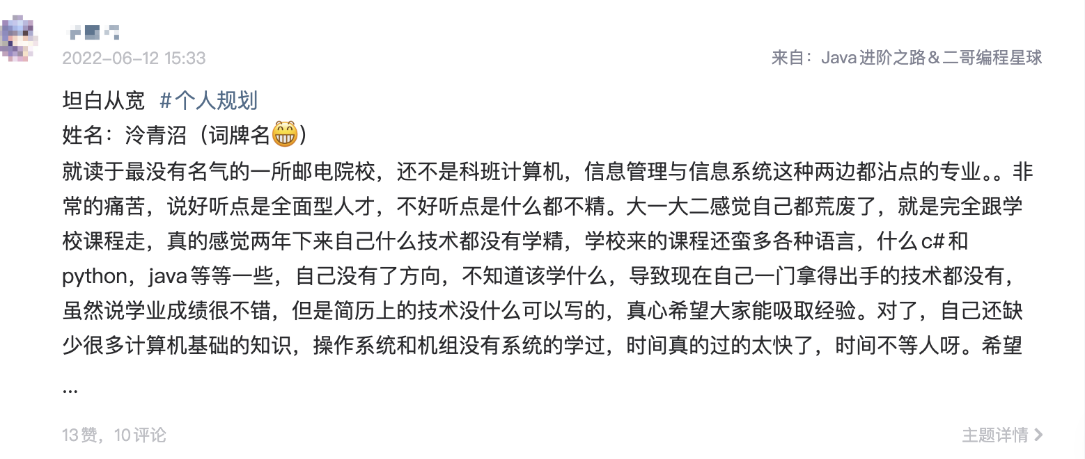 他是 2022 年 6 月份加入的星球,他在坦白从宽写这样写到:大一大二都荒废了,只知道跟着学校的课程走,但简历上的技术好像没什么可写的。