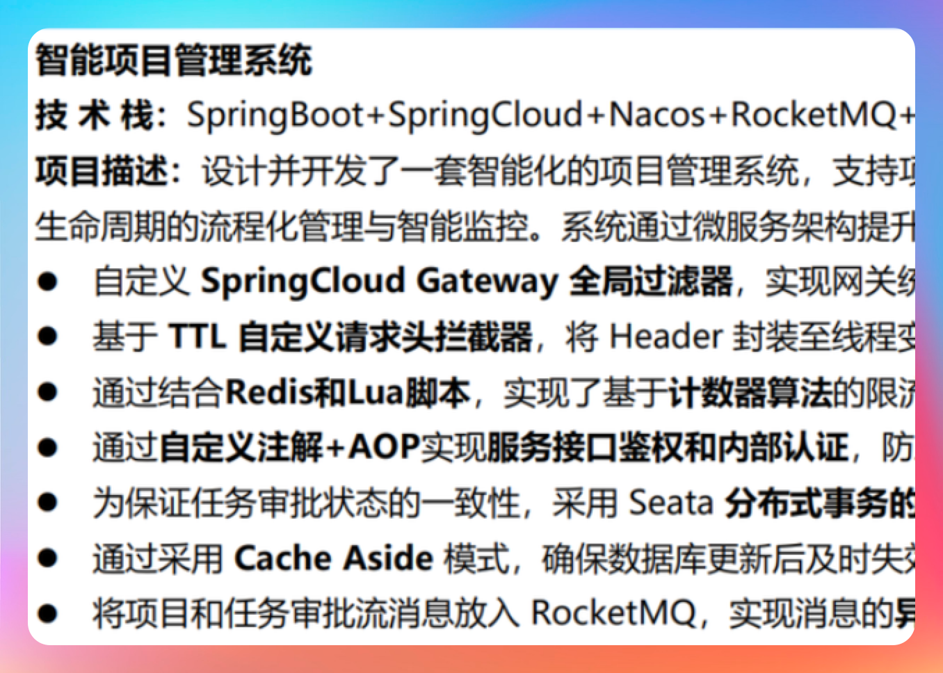 换句话说,如果你写了 Spring Cloud,你就应该也提到 Nacos、Gateway、Sentinel、Seata、Skywalking、OpenFeign 等等这些,并且分别用它们实现了什么业务,解决了什么问题,有哪些量化数据,统统都要展示出来。