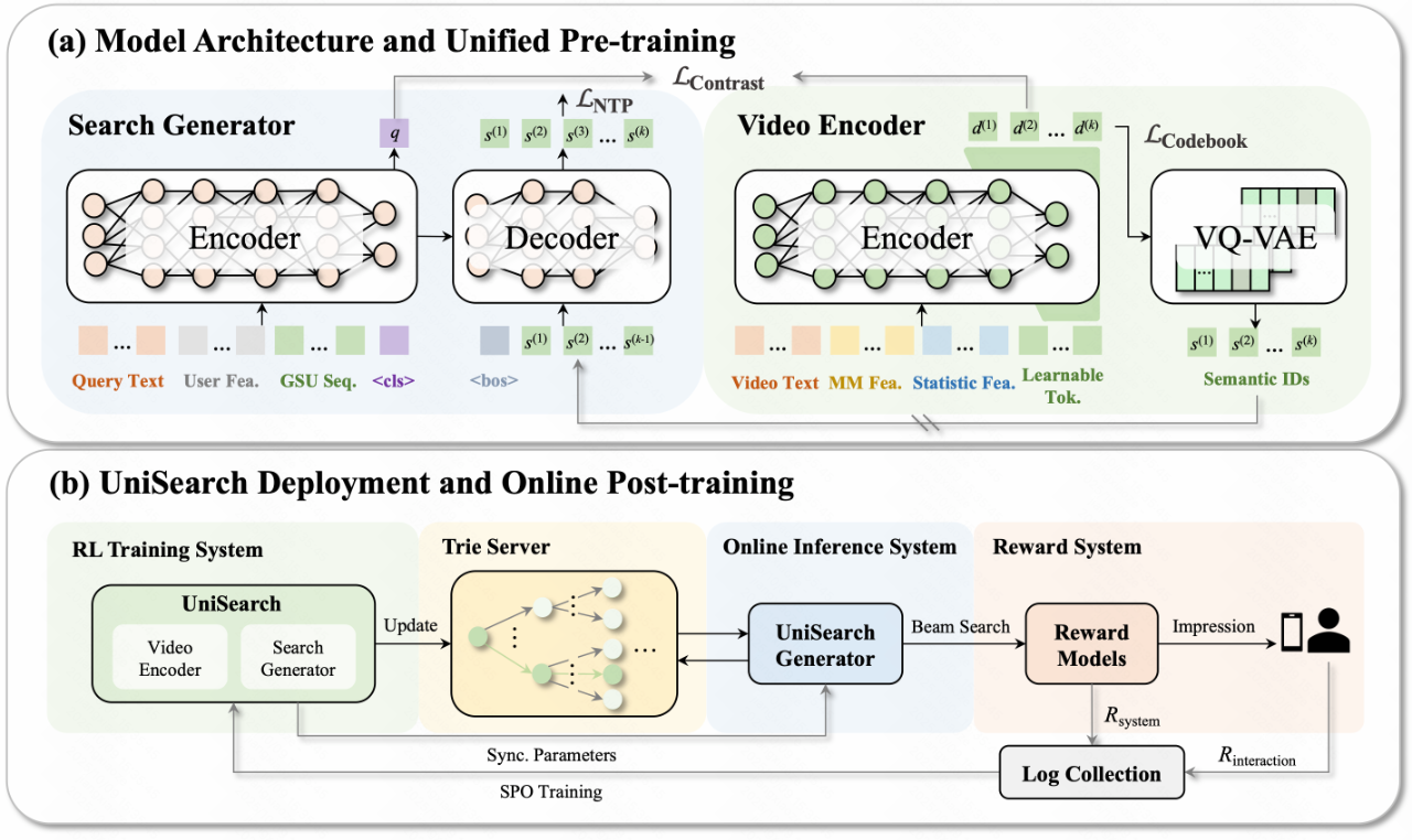 构建基于语义 ID + 生成式排序的搜索系统,复刻快手 UniDex + UniSearch 体系,统一“召回—排序”链路,实现语义倒排、生成式搜索、在线偏好学习等核心能力,显著提升长尾 Query 的召回率。