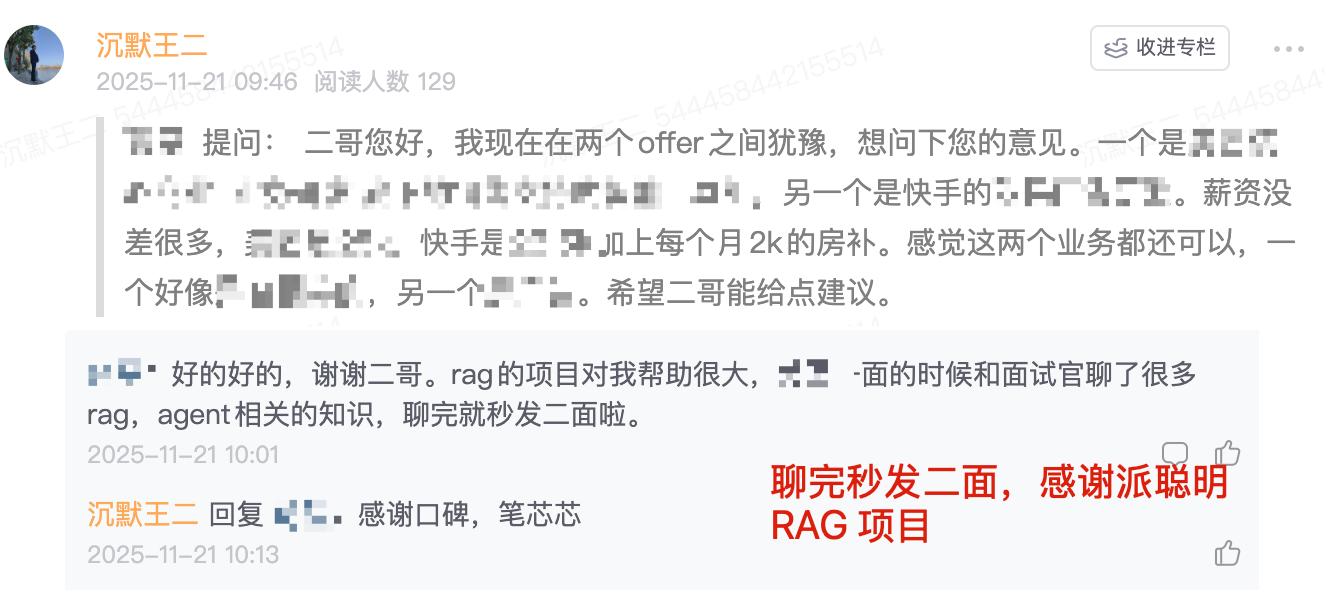 拿到快手 offer 的球友就直言,派聪明 RAG 项目对他的帮助非常大,以免的时候和面试官聊了很多 RAG、Agent 相关的知识,聊完秒发二面。