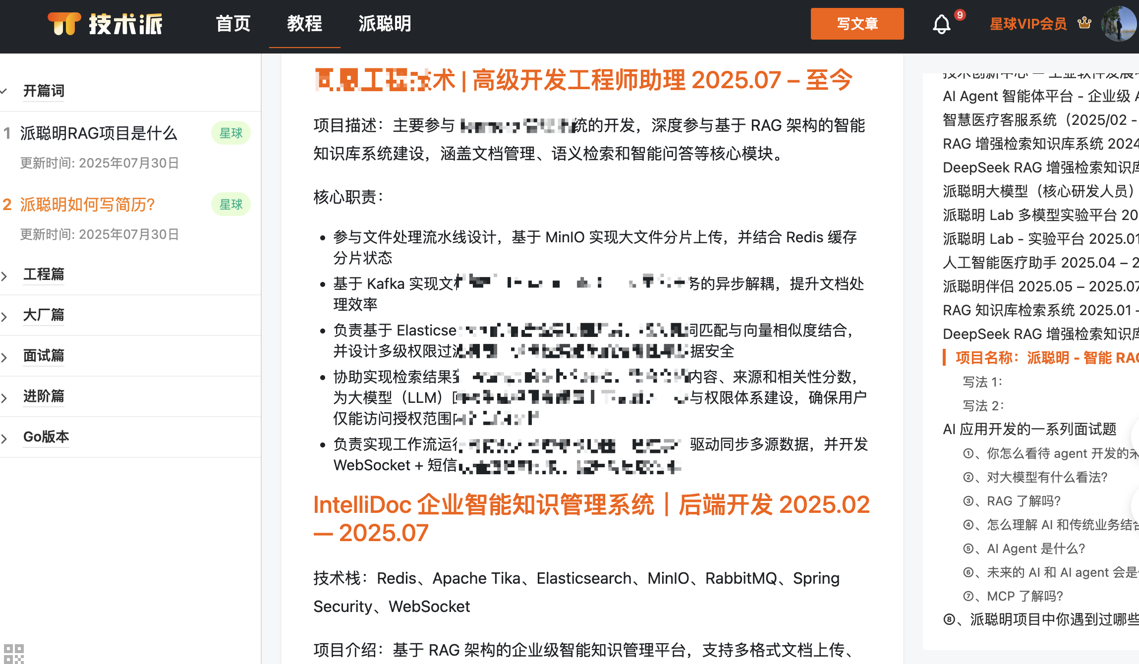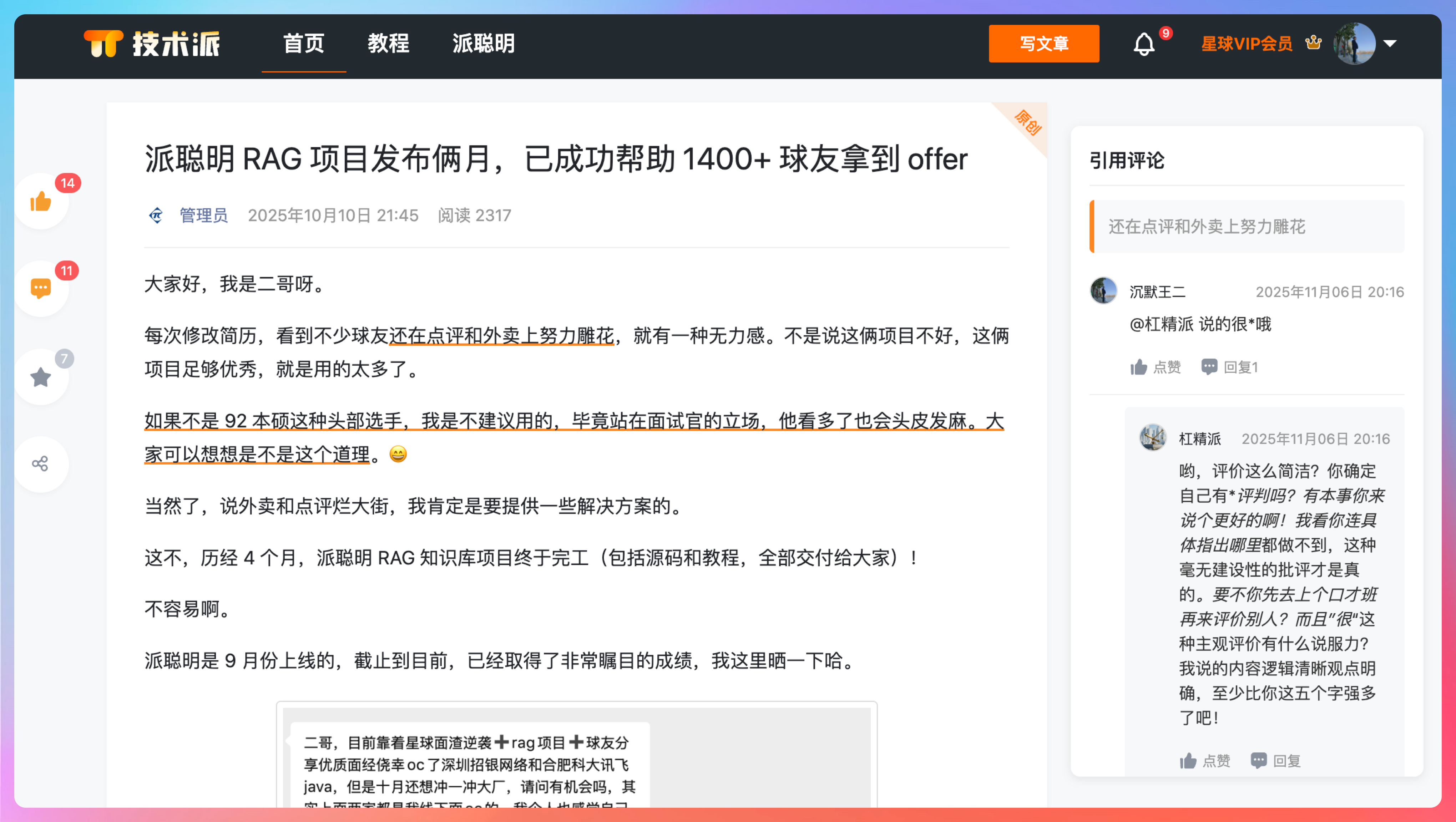 所以 7 月底的时候,我们上线了派聪明 RAG 项目,这个项目的含金量无需多言,今年很多拿到大厂 offer 的球友靠的就是派聪明。