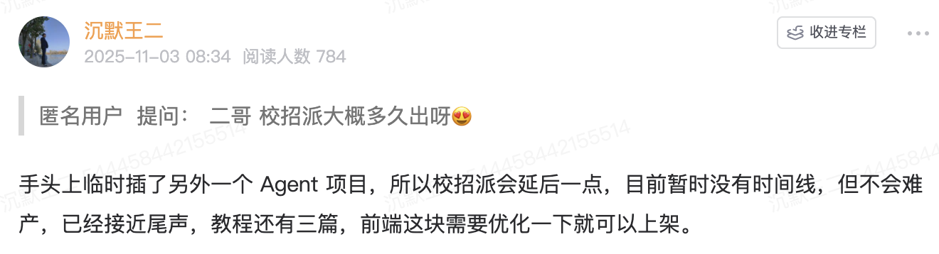 另外,我需要说明一点,校招派 Agent 项目暂时会延后上线(最晚 27 届暑期实习前上架),因为手头上临时插了另外一个项目,也是 Agent 相关。