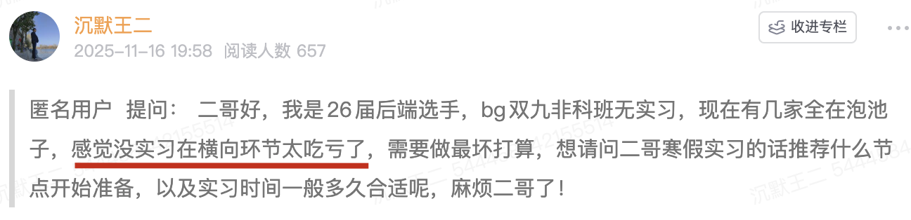 包括秋招的横向对比,已经不止一个球友在星球里发出这样的感慨:没有实习在横向环节太吃亏了。
