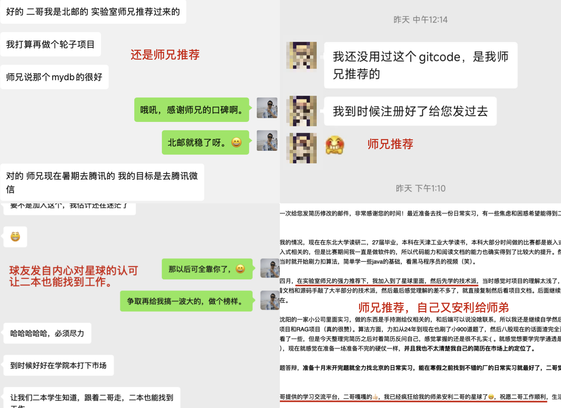 有复旦大学的球友反馈,修改后的简历解决了他暑期实习的困惑。有四川大学的球友反馈,在二哥的指导下成功入职百度。