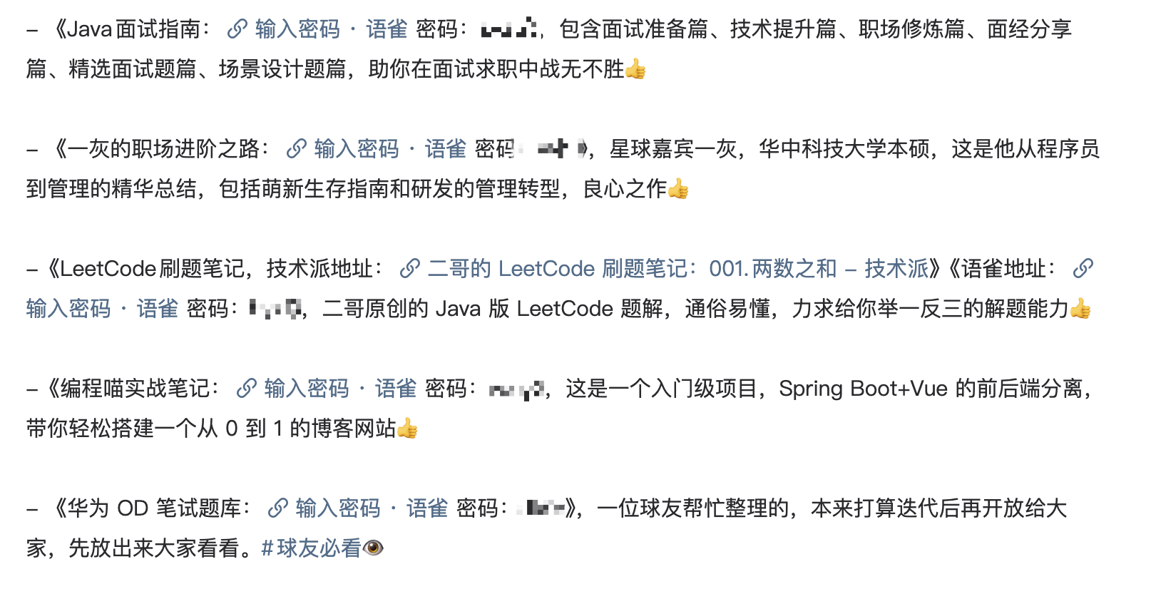 方式很简单,加入二哥的编程星球,就能在星球的第一个置顶帖「球友必看」里查看专栏加密后的语雀地址。