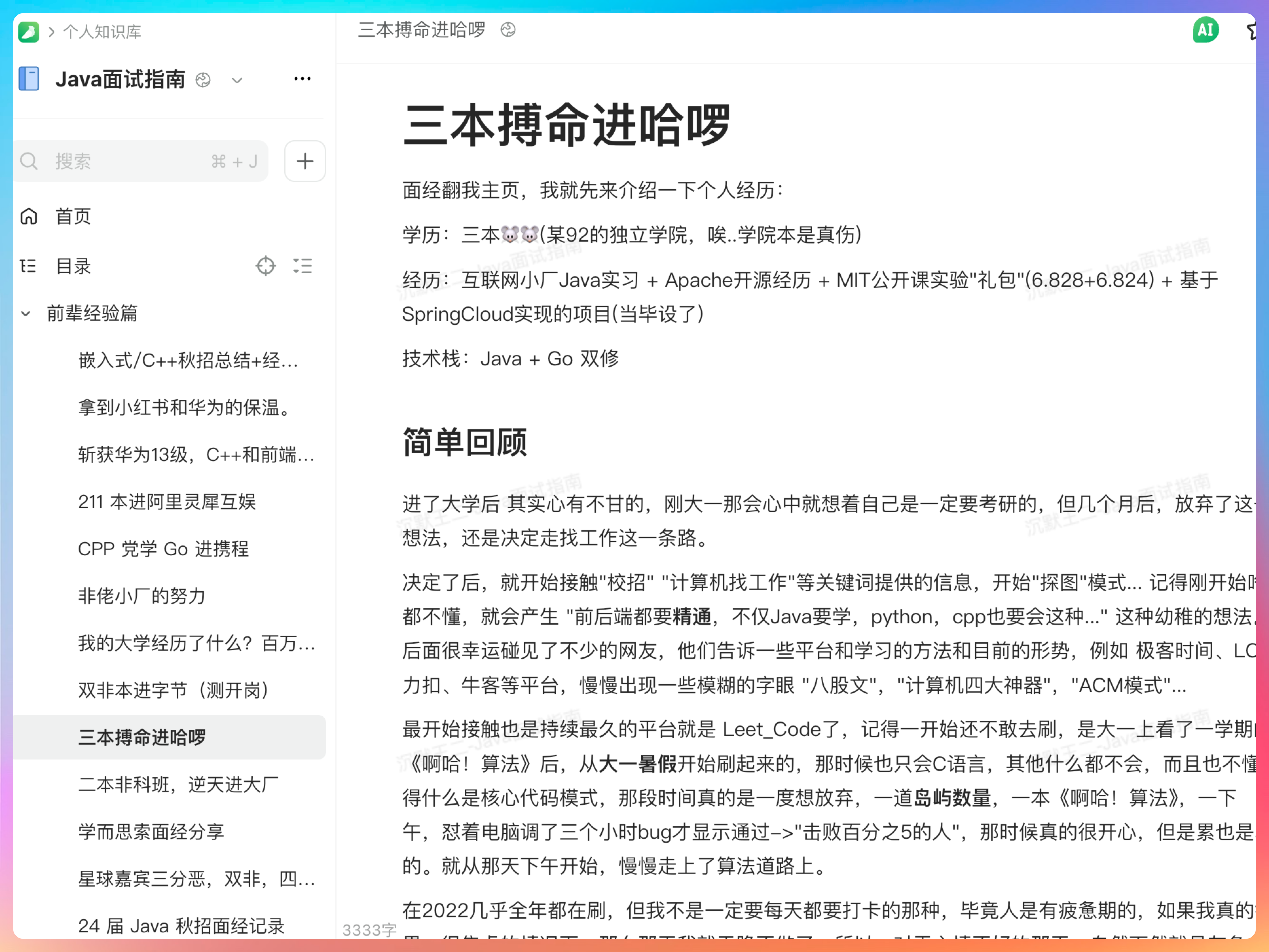 说背可能有些功利,其实大家也可以把《面渣逆袭》拿来作为技术复习的大纲,做到有的放矢。针对每一道题,去深究一下背后的原理,尤其是如果能结合源码的话,技术的成长也是非常迅速的。