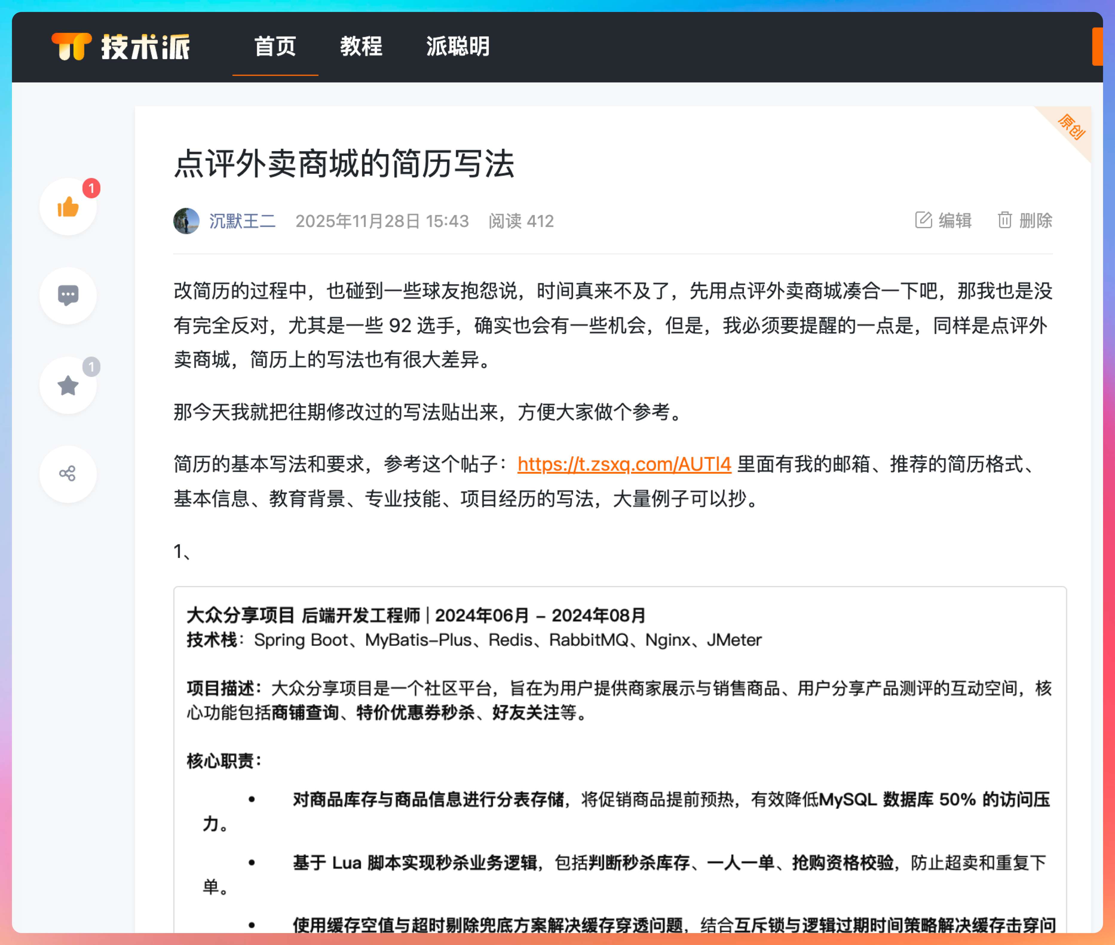 外卖点评商城的简历写法:https://paicoding.com/article/detail/2533200012845057