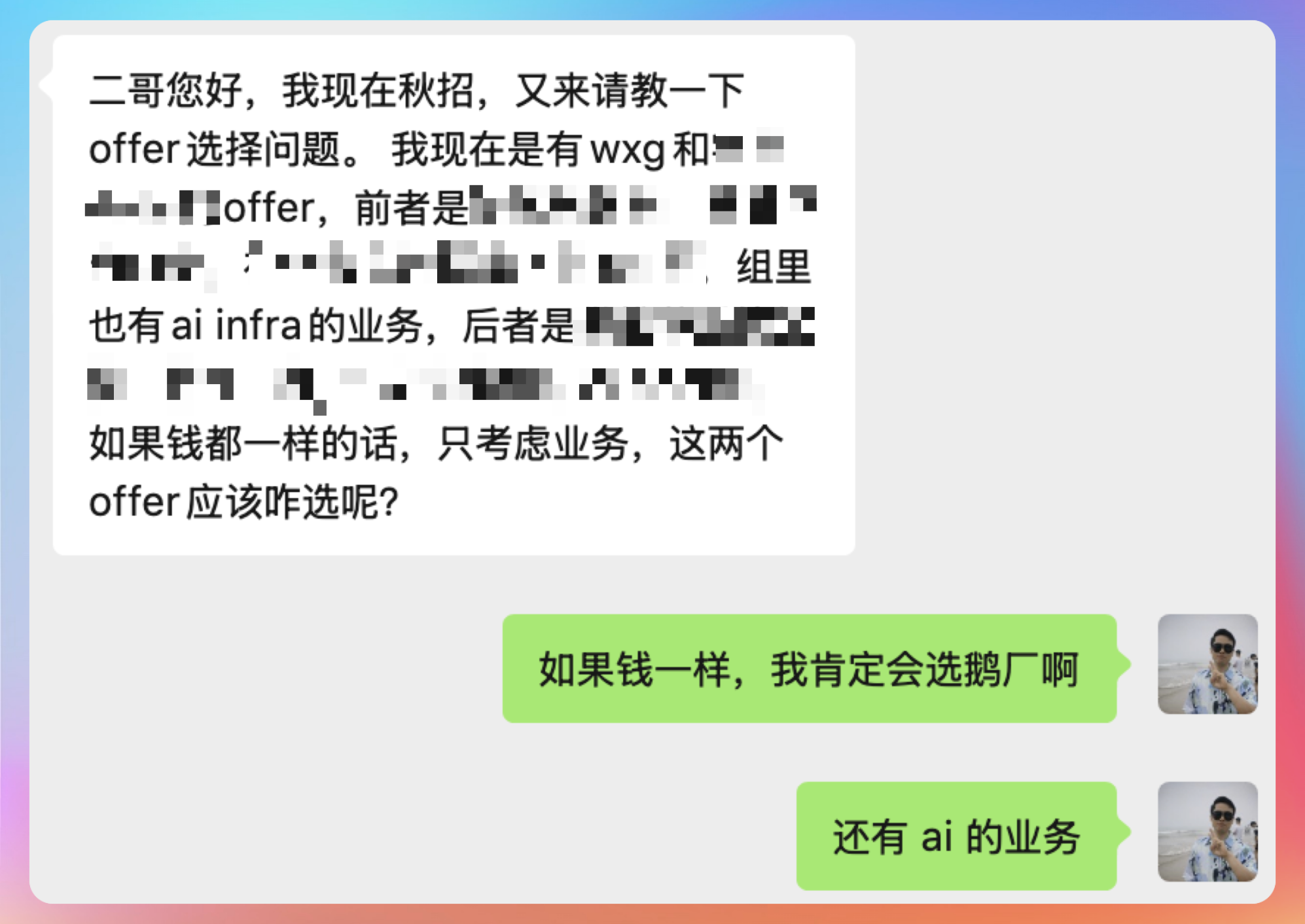 这不,星球里就有球友拿到了 wxg 的 offer,偏基础架构,也有 AI infra 的业务。他还有另外一家大厂的 offer,问我钱一样多的话该怎么选?