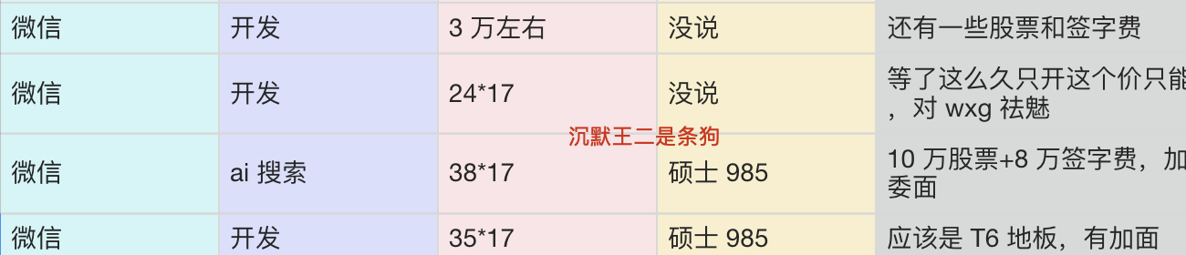 - 硕士 985,开发岗,开了 35k,应该是 T6 地板价,有加面,base 深圳。