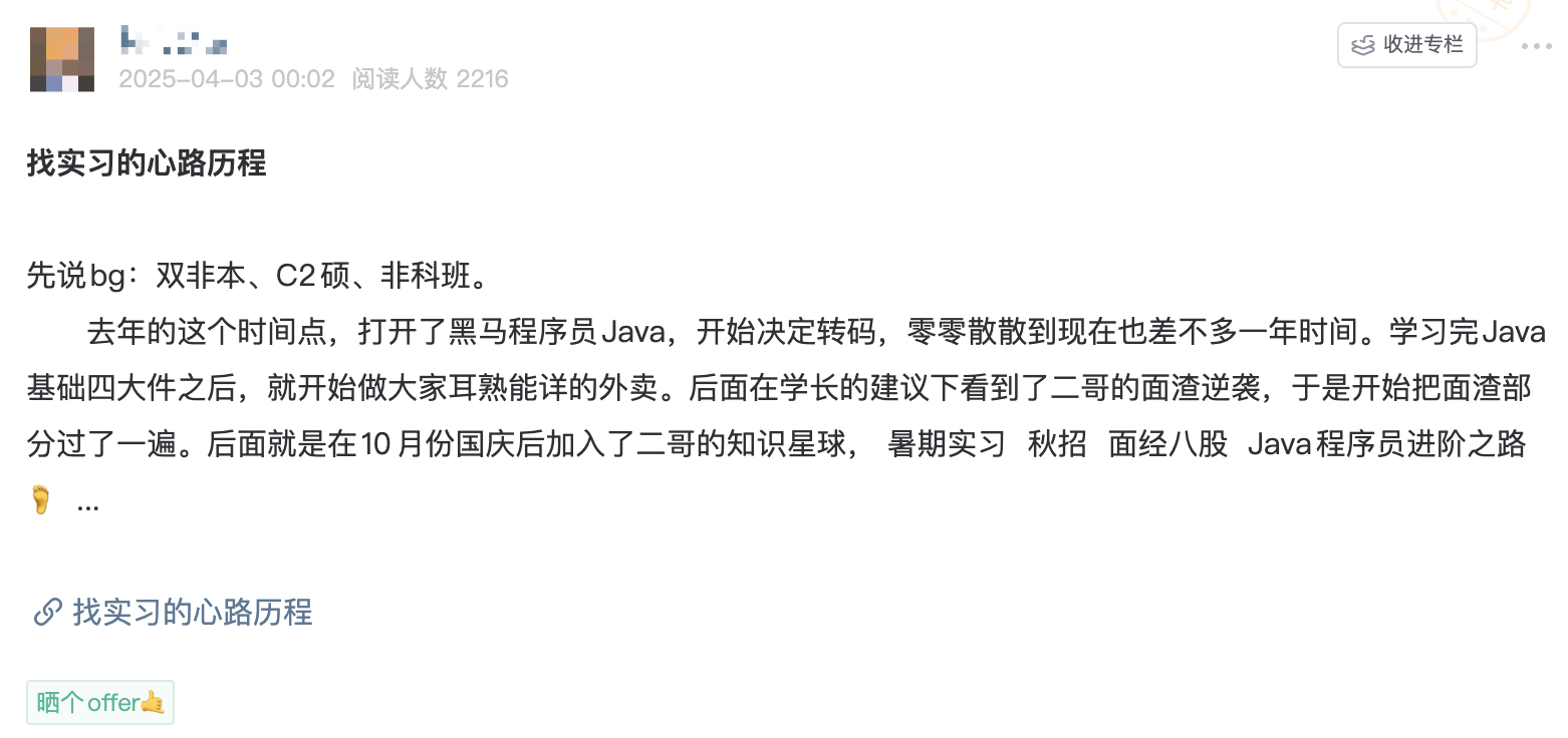 他是去年 10 月份来星球的,求职过程并非大家想象中的一帆风顺,一开始也挺折磨,直到今年 8 月份才开悟,他的经验和方法论非常值得推荐给 27 届的同学,以及要冲春招的 26 届同学。