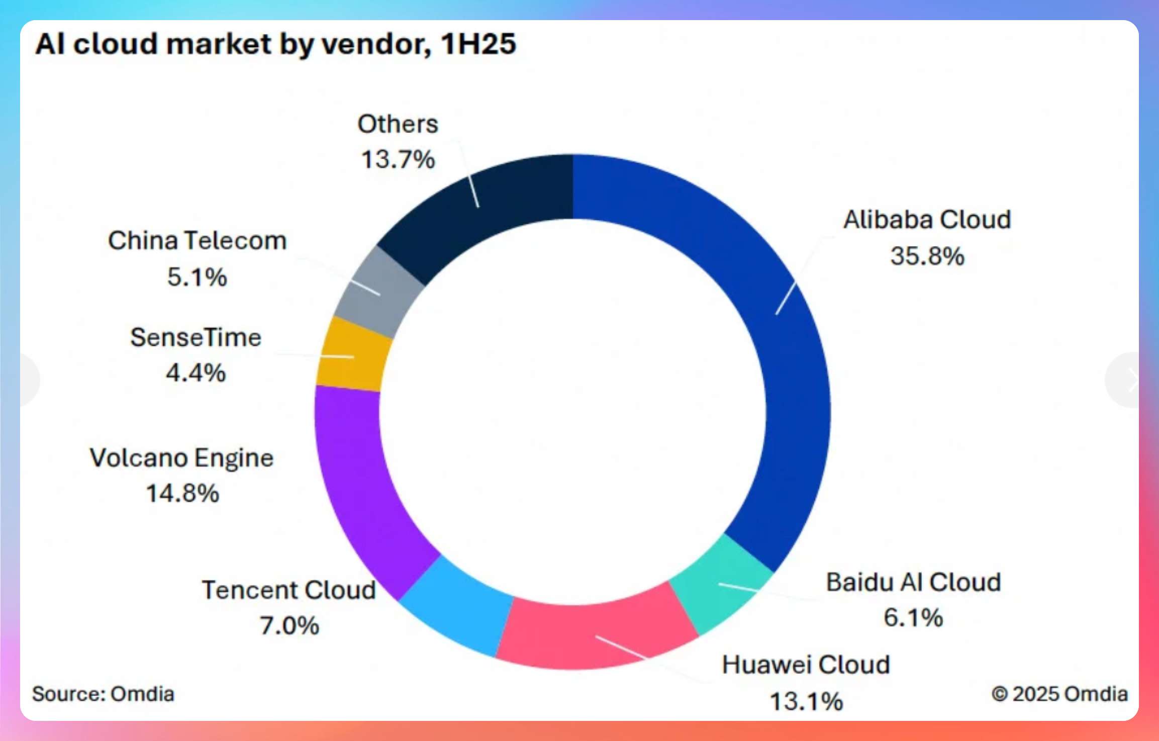 看到一个数据,由 Omdia 发布的 2025 年 上半年“AI云”市场规模:国内 AI 云市场规模达 221.9 亿元。其中阿里云占比 35.8%,高于 2 到 4 名的份额总和!