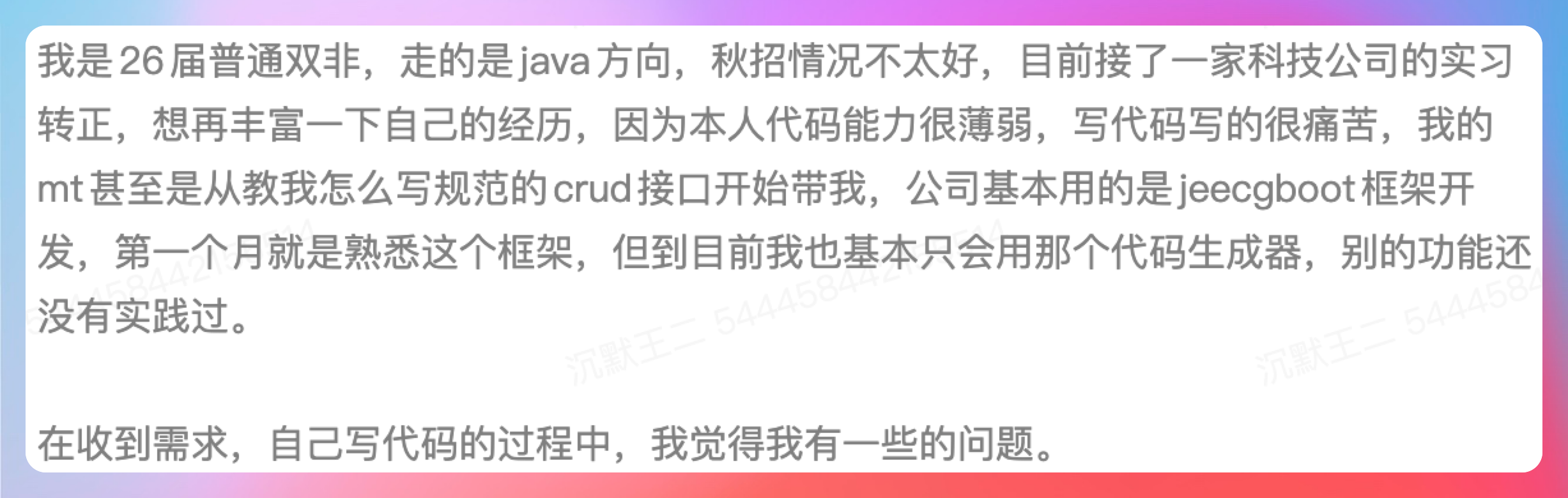 我要告诉大家的是,先别着急否定自己,代码能力差,几乎每一个刚进入职场的新人都会经历这样一个阶段,包括我当年也是这么过来的。